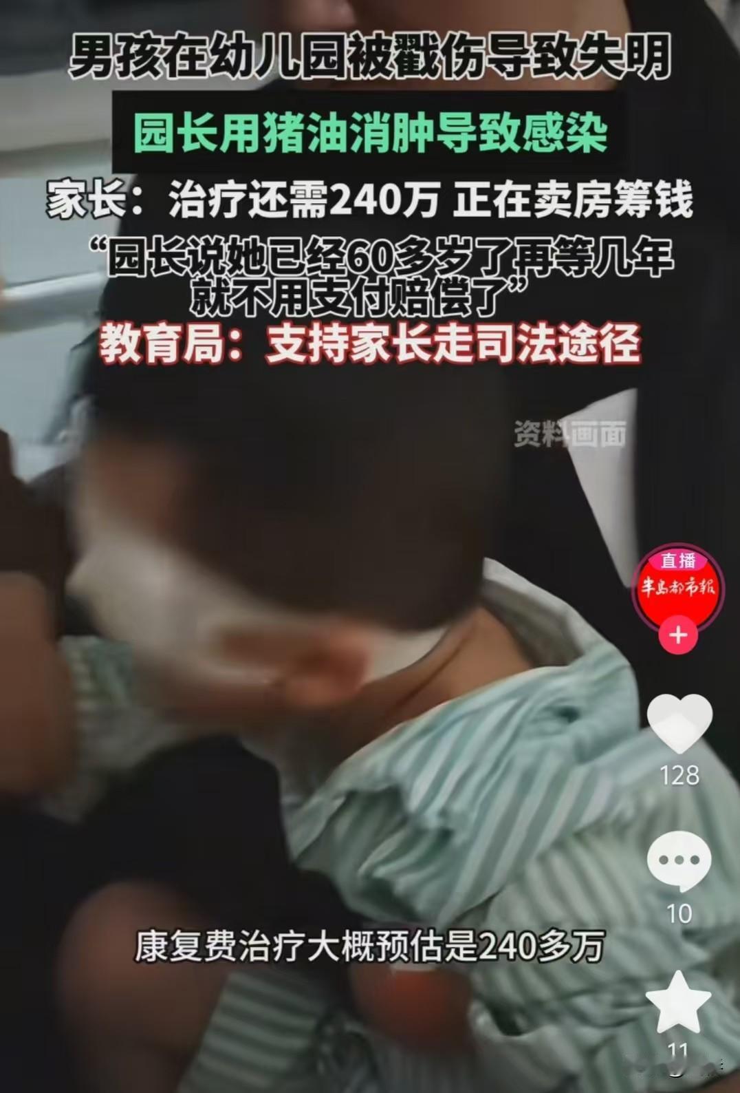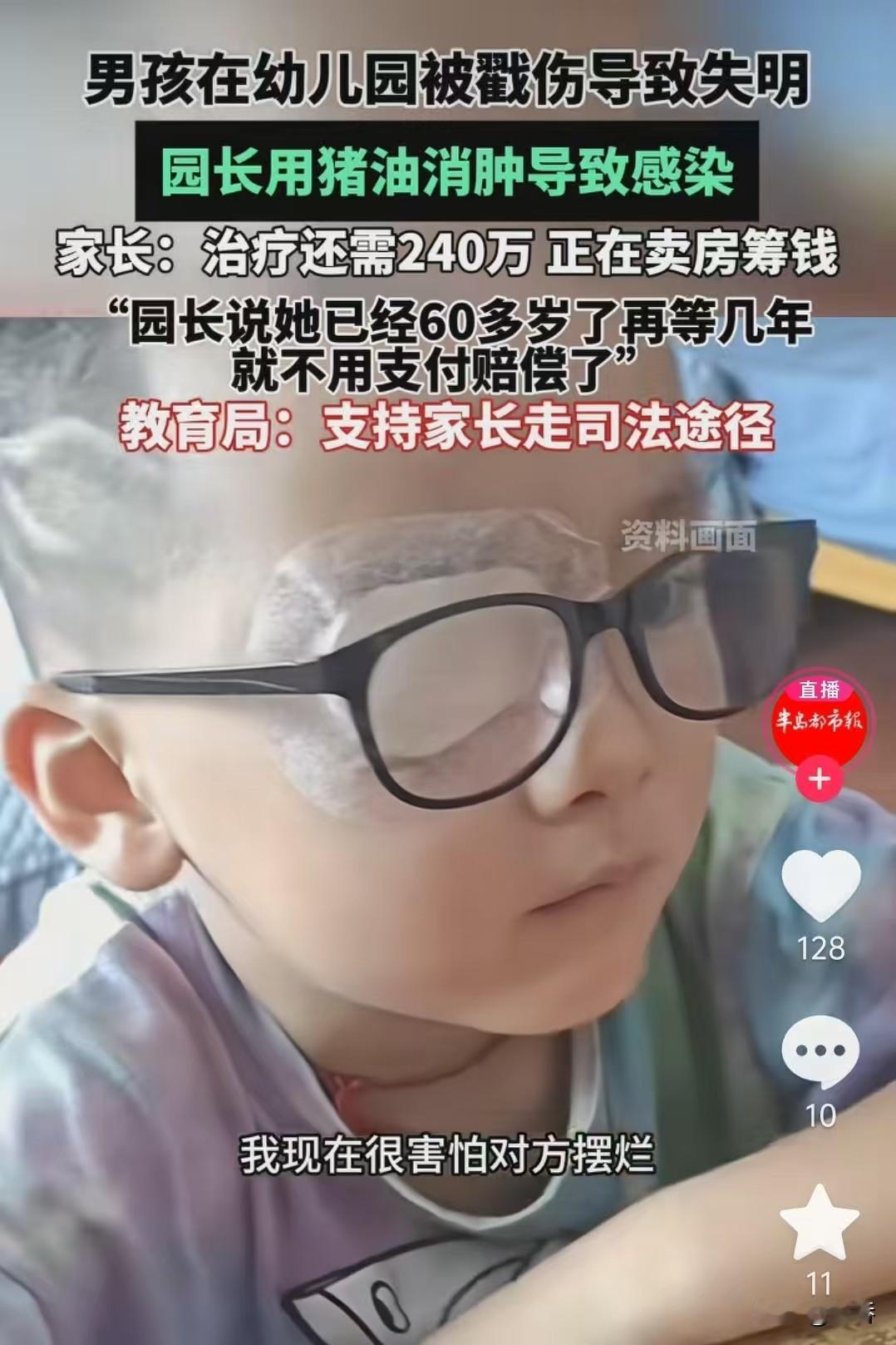 江西瑞昌,5岁男孩在幼儿园被同学戳伤失明,园长在伤口涂猪油导致感染。更令人愤慨的是,园长竟然说出这样的话,让人更加寒心。 据男童的妈妈魏女士介绍,孩子后续的康复费、治疗费等大概预估是240多万,家里已经是把房子挂在中介,随时都会卖出去,为孩子筹医药费。 可是幼儿园负责人的态度太让人寒心了,也不让家属查看监控定责,甚至说出了这样的话,负责人说“我现在60多岁了,等个几年就是无民事行为能力人了,对于对将来的费用不予支付”。这样的态度确实让人害怕,想来他们就是想把事情一拖再拖,拖到你自己放弃为止,反正要钱没有。而教育局方面也是在积极地协调处置这个事情,希望有个好的结果。 有网友说。本来一个好好的孩子,一不小心毁了别人的一生,还不肯配合调查和治疗,难道良心不会育吗? 老话说的好“不是老人变坏了,而是坏人变老了”。这样的幼儿园负责态度,谁会放心把孩子交在他的手里。