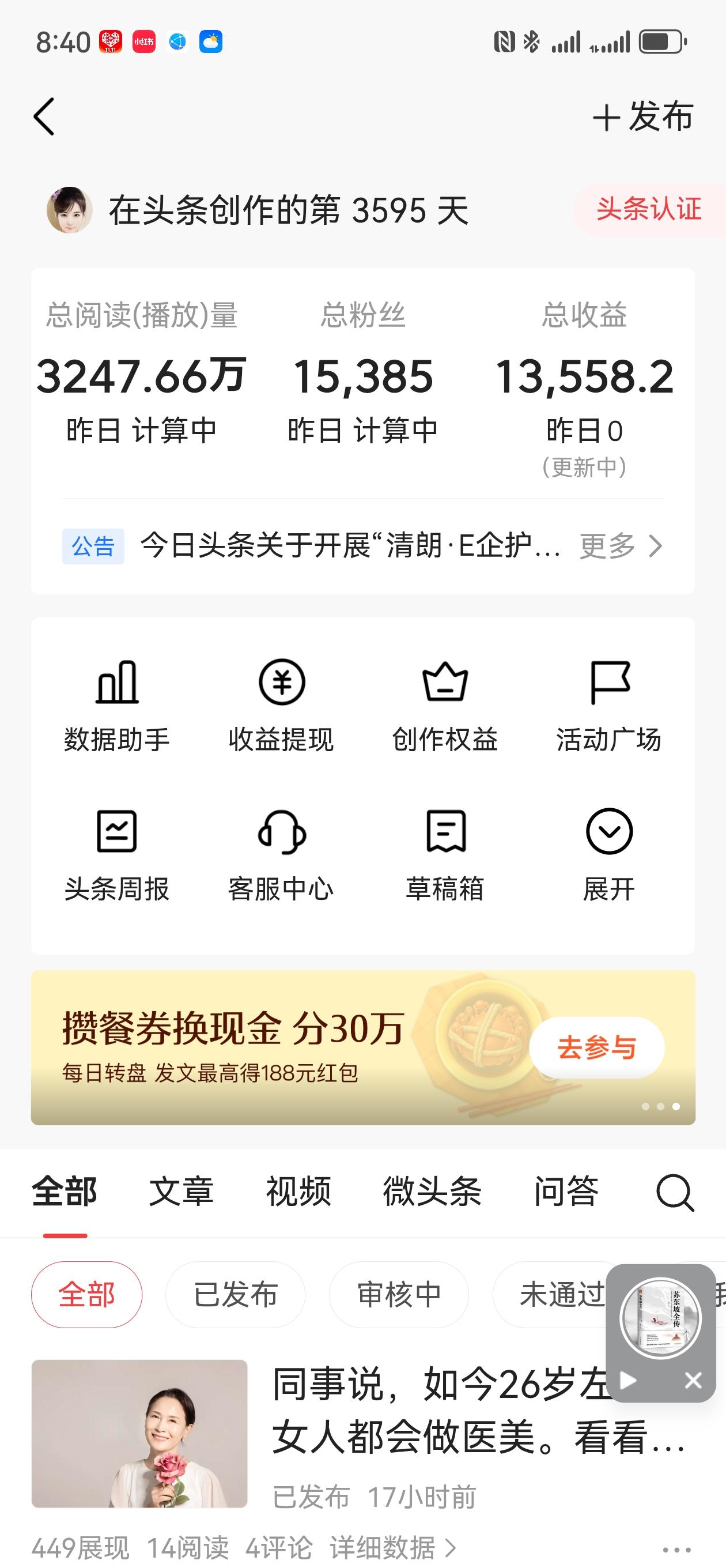 兼职写作,十几年收入10几万,我觉得还行。 丰收不叫丰收偏得的。 记得20多年一个编辑采用了我网络上的一篇文章,联系到了我,通过邮局汇款给了我16元钱。当时我特别自豪 在2014年,我在公众号投稿了一篇文章,采纳后稿费400元,于是给公众号投稿成了我自媒体的主要收入来源。 2016年来今日头条,后来又是自己的公众号,去潘茄写小说。 小红书,呵呵,我觉得这都是我不做家务省出的时间。 我写文章交税,大概也有2000多吧 因为稿费超过800就要交税了。 我觉得纳税光荣,尤其是如我一样兼职的。 写文章于我是锦上添花,大小也算是文化人,写作者。 在家里有话语权 ,比如今天我早起听书:红楼梦。 老公听破案小说,于是我就喊他,赶紧关了,别影响我。 老公说,哎呀,我也想听。 我说,我听书赚钱,你听了没啥用。 呵呵,他赶紧关了。 这就是女人赚钱的好处,大家觉得是吧。写作与收益 写作赚钱平台 写作收益