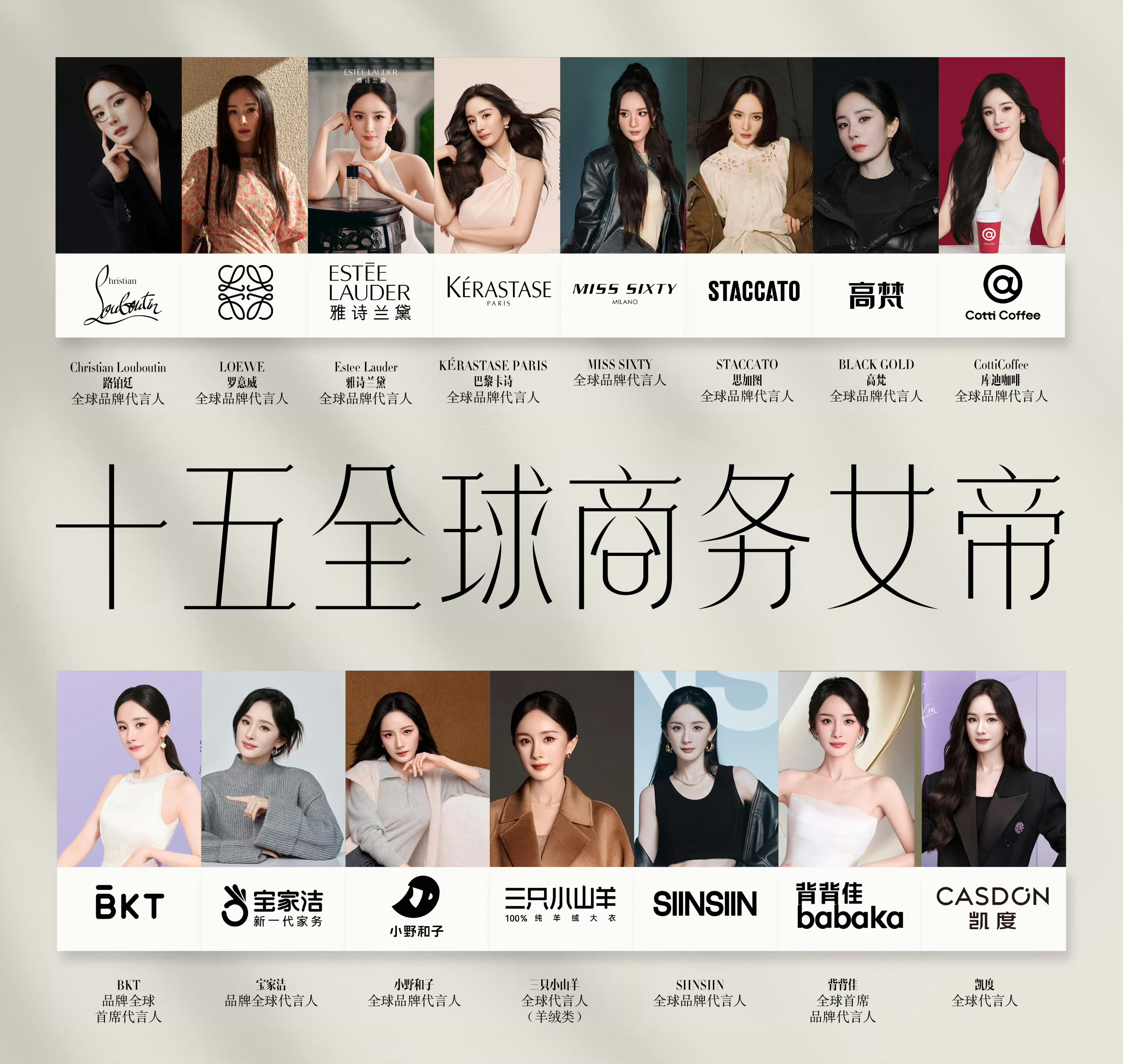 目前杨幂手握28个代言合约,年内新增13个,包含15个全球title,内娱女星TOP1,代言涵盖顶奢、服饰、鞋履、美妆、护肤、洗护、食品、饮料、母婴、家居、电器、3C科技、汽车、游戏及生活服务等全品类,商务届的全方位战士,商务女王[赢牛奶]杨幂
