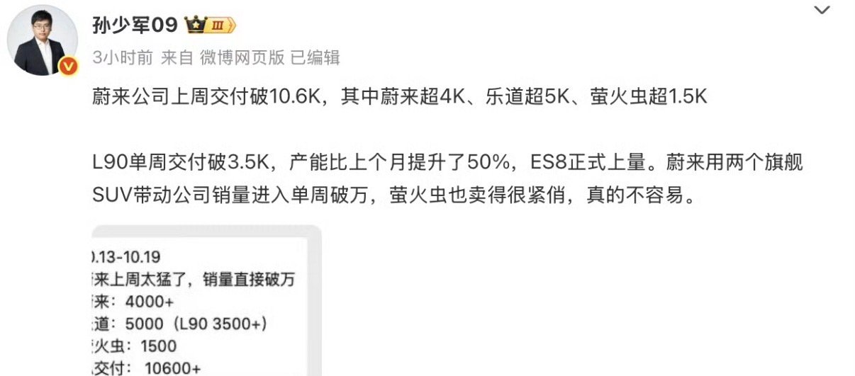 数据显示,蔚来汽车上周销量突破10.6k,其中蔚来品牌超4K,乐道超5K,萤火虫