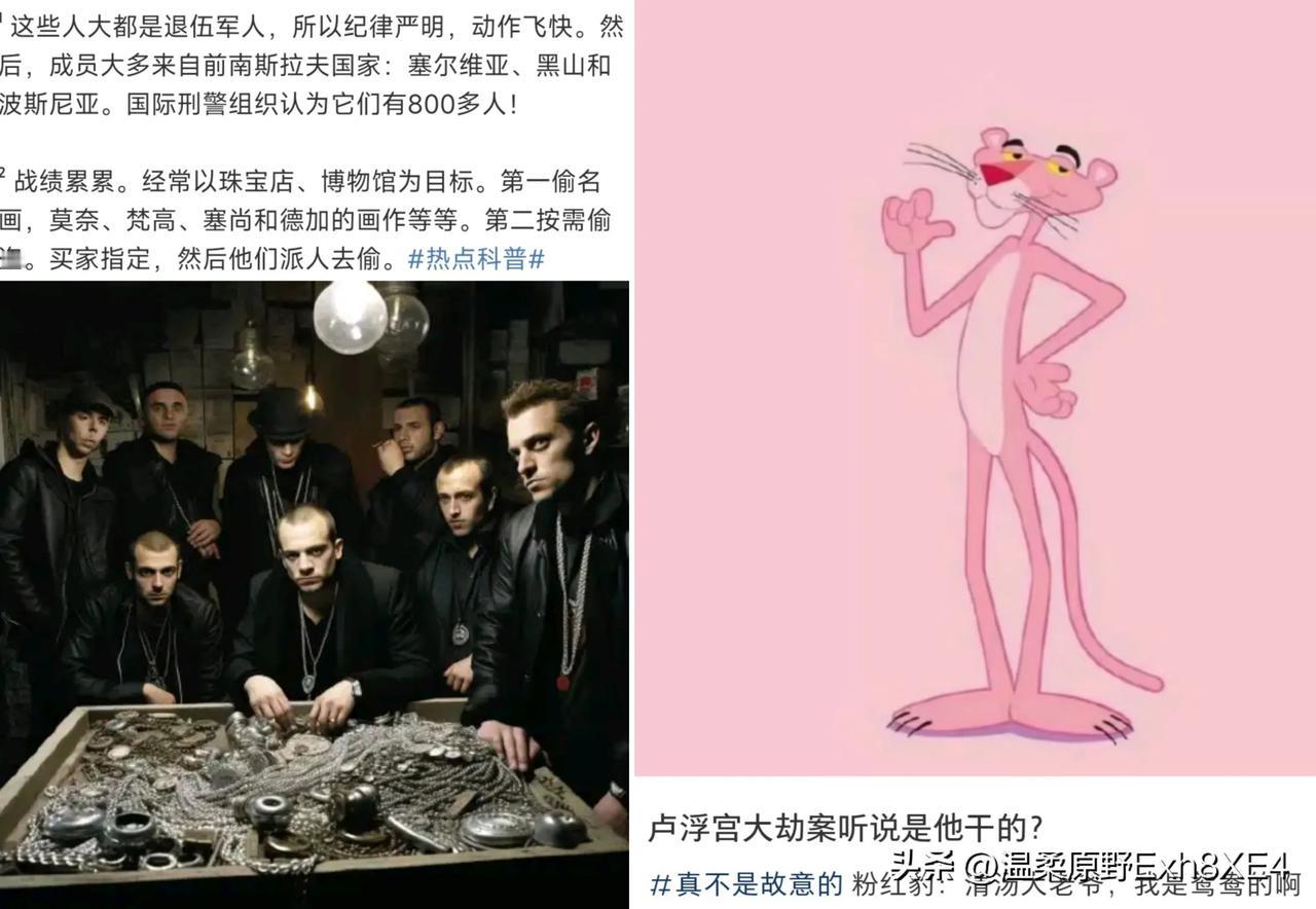 “卢浮宫劫案可能是粉红豹所为,专业犯罪团伙们分解这些珠宝,1个小时不到就能搞定” 事后从事侦探的退休总警司和专家分析后说明,粉红豹是何许人呢? 据公开信息,粉红豹是一群大多由南斯拉夫前军事人员、1999年成立的、专攻盗抢珠宝钟表的犯罪团伙。大该有200人,经常以珠宝店、博物馆为目标,战绩累累。当然也接受客人指定,要哪个就偷哪个,该团伙也以此闻名“订单式定制盗窃” 不过当地网友更多的是质疑: 1,粉红豹以“180秒准则”著称,此次耗时7分钟,远超其典型风格 2,劫匪现场遗弃一件皇冠及部分设备,违背粉红豹“零痕迹”的完美犯罪原则,也与他们的身手和专业度不匹配 3,未盗取展厅内价值更高的“摄政王钻石”,动机不符合粉红豹的利益最大化逻辑。 不管是不是粉红豹所为,就是可惜了哪些文物珠宝,拆成七零八落的,价值可是大打折扣! 还有上个月还是法国博物馆,中国瓷器被盗了3件(全是顶级藏品)。卢浮宫内也有3万件中国文物,你们既然保护不了,还不如还给我们,国内的博物馆可从没听过抢劫的荒唐事!