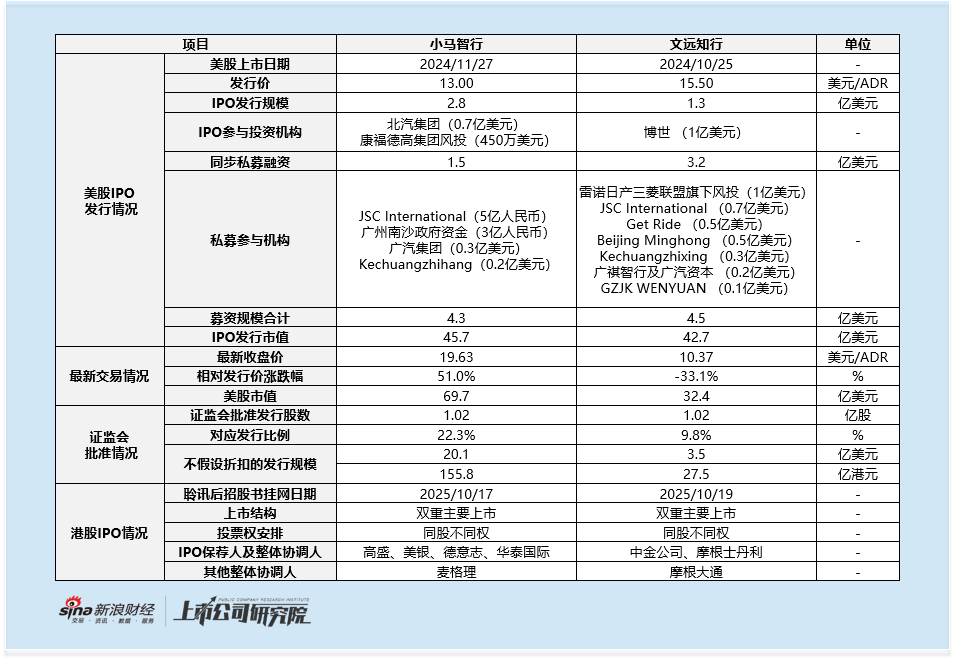 继今年9月16日禾赛科技登陆港股成为中概股回港标杆后,中国无人驾驶领域再迎两大头部企业密集赴港上市。10月14日,中国证监会同步发布PonyAIInc.(小马智行股份有限公司)和WeRideInc.(文远知行公司)境外发行上市备案通知书,前者拟发行不超过102,146,500股普通股,后者拟发行102,428,200股普通股。随后,10月17日小马智行提交聆讯后招股书,10月19日文远知行跟进提交,从美股转战港股的资本市场竞争正式拉开帷幕。尽管美股IPO规模市值接近,但上市后的股价走势、机构增减持态度却呈现冰火两重天的分化格局,深刻折射出资本市场对二者价值判断的鲜明分歧。