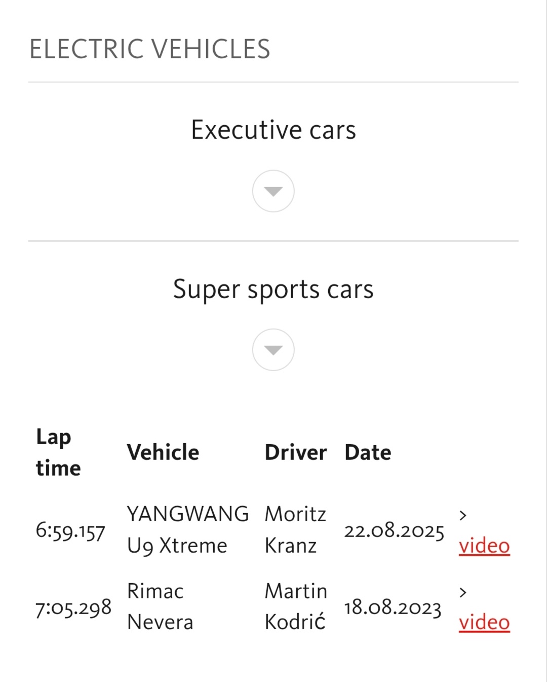 该车于2025年8月22日在北环赛道创下单圈6分59.157秒的成绩 ——比之前电动超级跑车类别的圈速纪录快了超过5秒,并且是该类别中第一次突破七分钟大关。