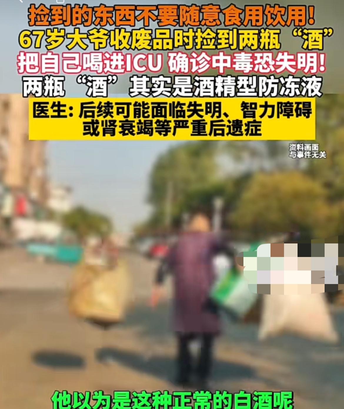 唉,捡到的东西真的不能随便用啊! 河南,一个67岁的大爷在街上收废品时,捡到了两瓶装有透明液体的瓶子,他特意打开闻了下味道,除了酒精味别无其他。 大爷就此笃定里面装的是白酒,虽然外包装什么说明都没有,他还是把那个液体当成白酒喝了下去,谁知竟出现了这样的情况! 没过多久,大爷突然在家中晕了过去,被家人发现后紧急送往医院抢救,甚至进了ICU。 经过专业的检查,医生告知其家人: “此透明液体并不是所谓的白酒,而是防冻液。里面含有防冻剂和各种添加剂,一般用于车辆日常保养。” 并且,此液体对人类的身体危害极大,误饮后会导致乙二醇与甲醇混合中毒,仅20毫升剂量就可能会致命! 事发后,大爷一直躺在ICU抢救和解毒,后续他可能会面临失明、智力障碍、肾衰竭等严重后遗症。事已至此,现在我们只能默默祈祷他能平安无事,身体健康吧。 有则改之,无则加勉! 出门在外,捡到自己不认识或者不确定的东西,一定不要用在自己身上,更不能放入口中!有时候我们会产生侥幸心理,促使自己作出错误决定,最后只会害了自己! 来源:青岛新闻网 2025-10-19
