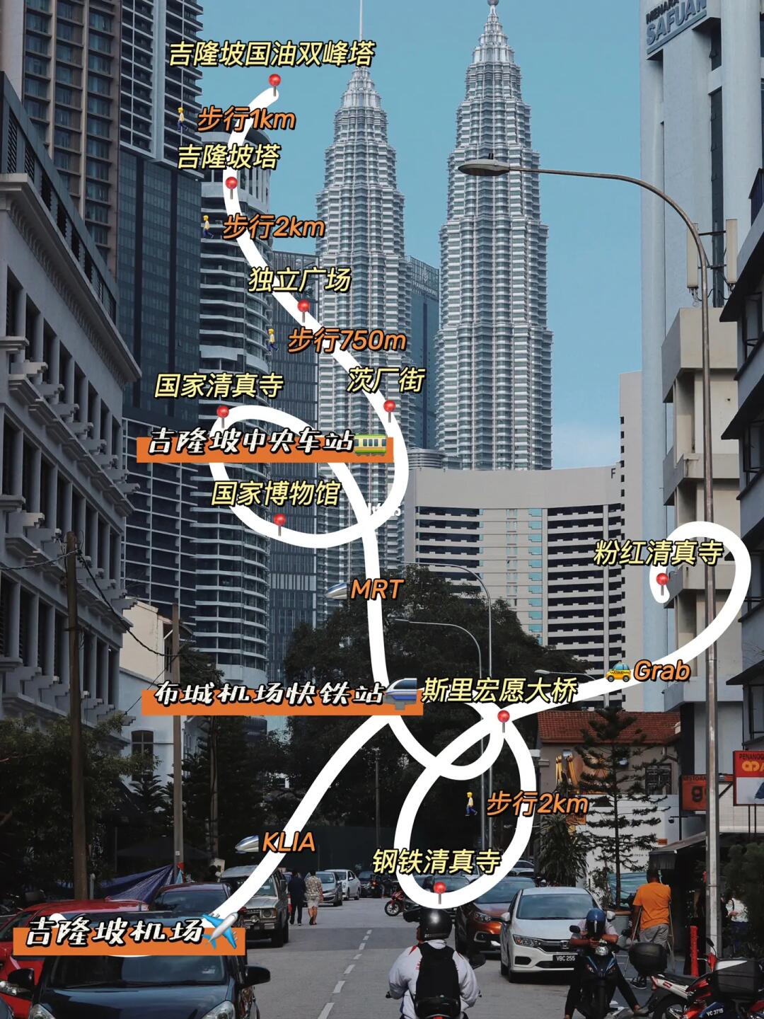 🚶🏻♂️一日游路线:吉隆坡机场—粉红清真寺—钢铁清真寺—吉隆坡中央火车站—国家博物馆—国家清真寺—茨厂街—吉隆坡国油双峰塔—吉隆坡机场