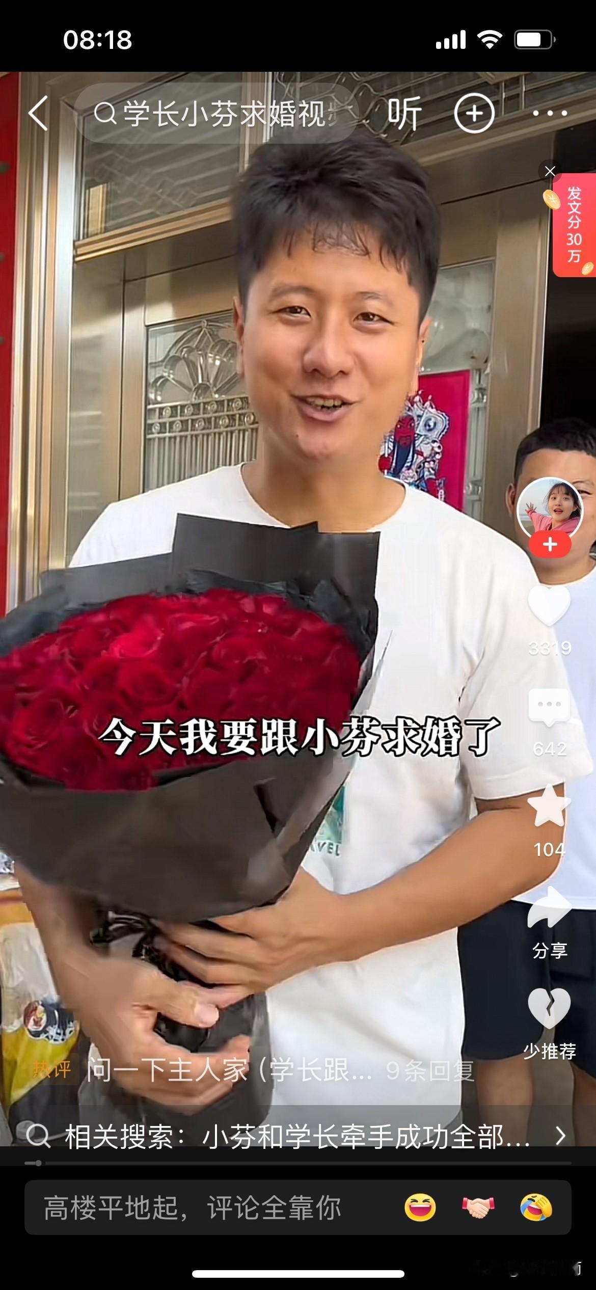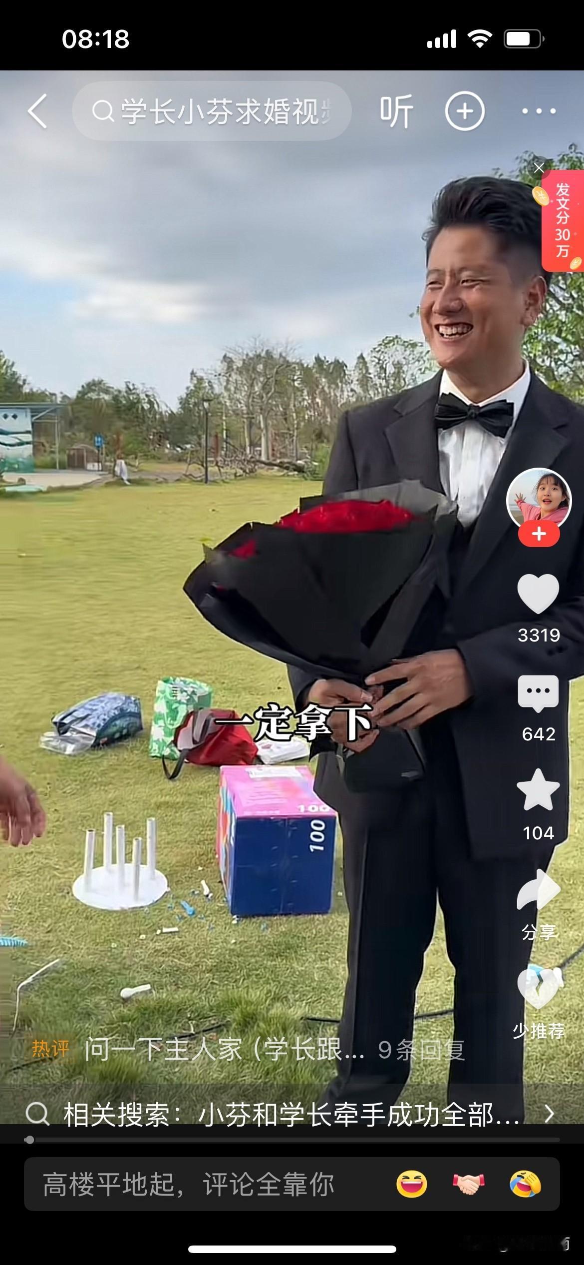 学长终于向小芬求婚啦! 为了给小芬一场难忘又浪漫的求婚仪式,学长把亲朋好友都邀来一同见证,甚至悄悄请来了远在几百公里外的小芬的哥哥嫂子。 所有亲人都在现场送上了祝福! 小芬太幸福了,能遇上这么有爱的大家庭。全网都羡慕你。最好的爱情就是相互成就,祝愿小芬早生贵子,事业家庭双美满! @小芬旅记(9号洗发水专场学长账号播)