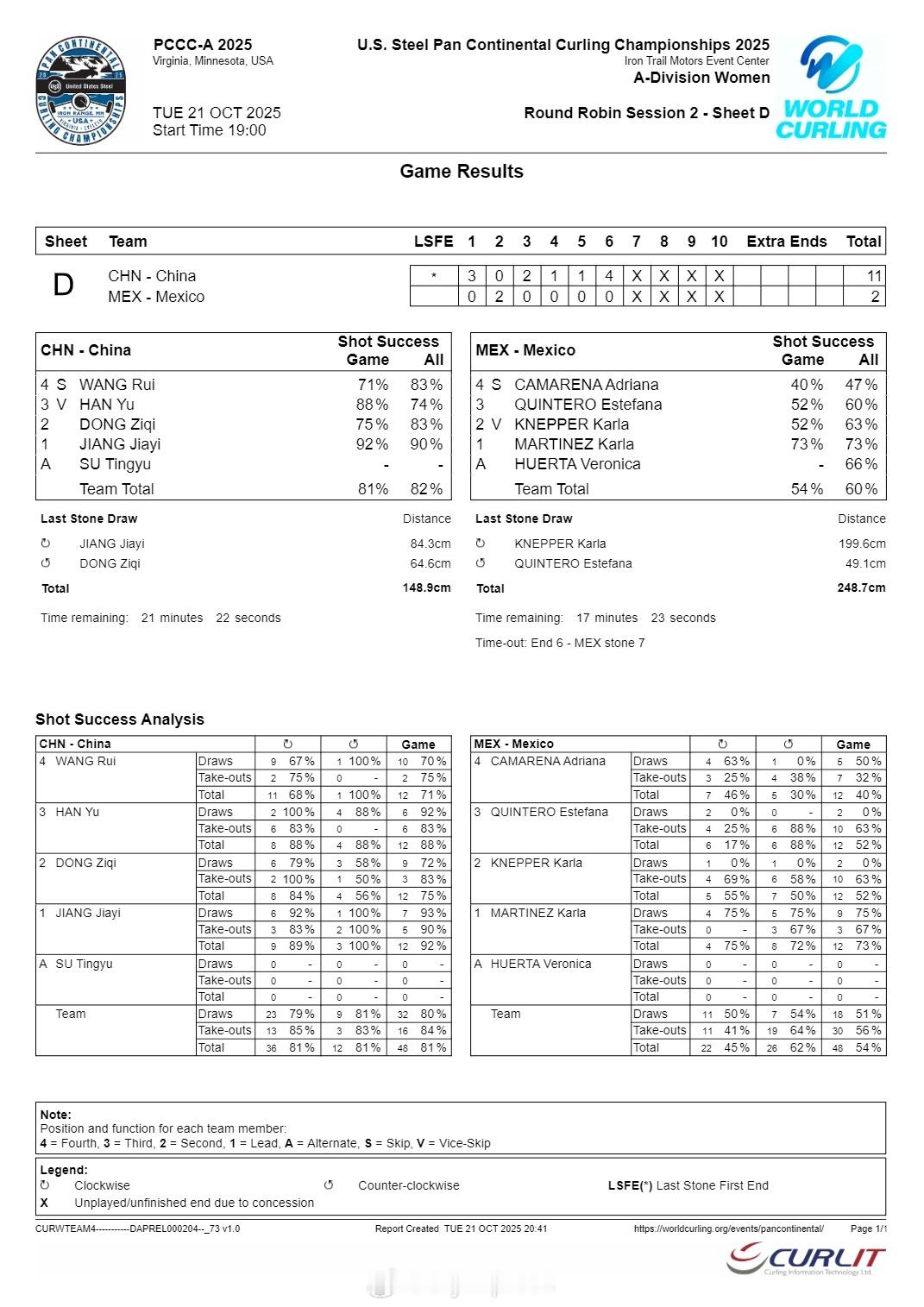 【泛洲际冰壶赛中国女队11-2轻取墨西哥 取得两连胜】国际体坛战报速递 10月21日美国维吉尼亚,泛洲际冰壶锦标赛中国女队在第二场比赛中11-2大胜实力孱弱的墨西哥,取得两连胜。墨西哥队在第二个后手局开始掉线,一直被偷分直至第六局送出4分,提前四局缴械。北京时间明天凌晨3时,中国队将对阵老对手日本。