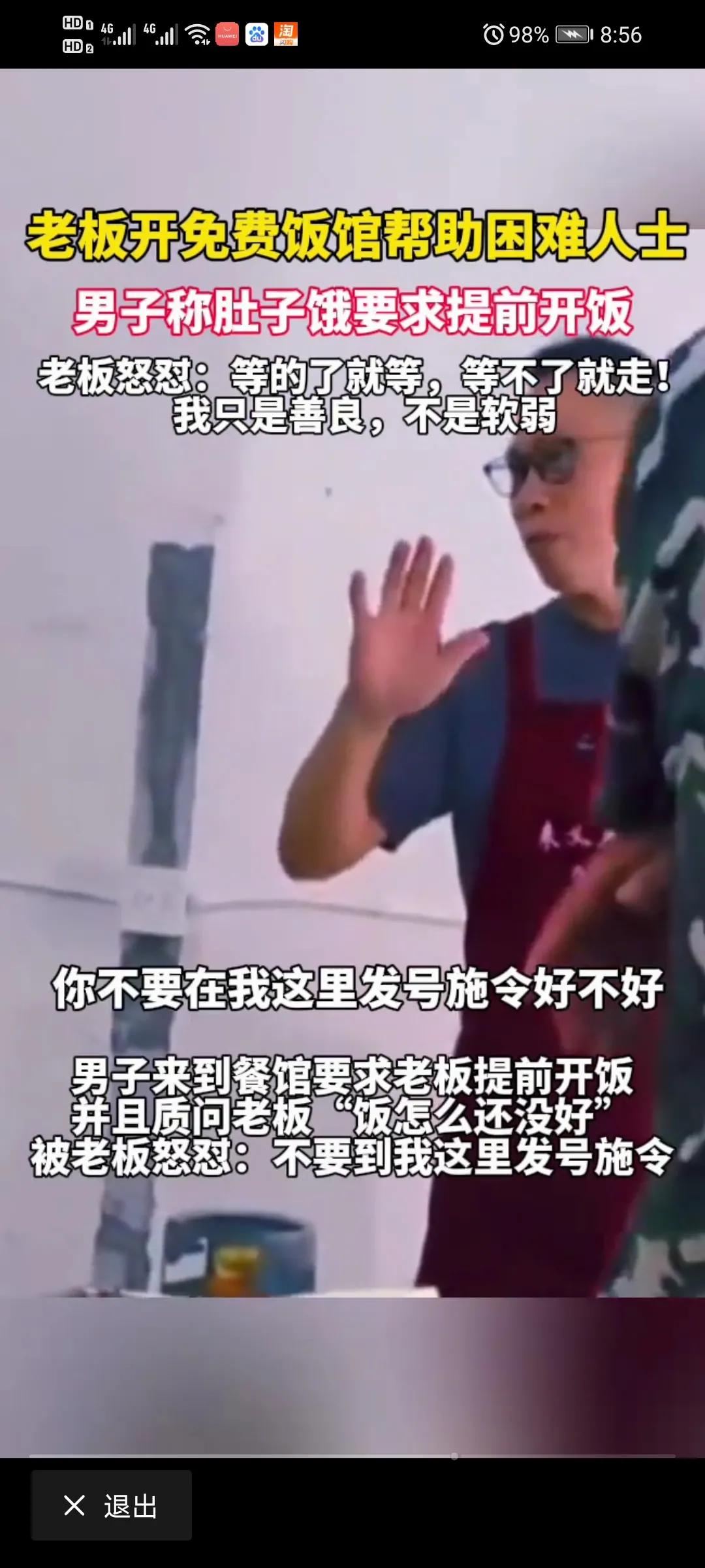 家人们,今天得说说免费饭馆的事儿。上海有个免费饭馆,每天11点半开饭。 这天11点刚过,有个中年男子不耐烦地喊着要提前开饭,说自己赶时间。志愿者解释饭菜没好,让他稍等。可这男子不乐意了,还大声说免费的就该方便他,现在就要吃。负责的张女士气得回怼:“免费的不是欠你的,这不是你家私人食堂!”。 我觉得吧,人家免费提供饭菜已经是大善举了,大家都在遵守规则排队等,你凭啥搞特殊?尊重是相互的,既然享受这份善意,就该守规矩。不能把别人的好心当成理所当然,不然以后谁还愿意做善事呢?咱都得懂得感恩和守规矩,这样社会的善意才能长久传递下去。 上海公司食堂