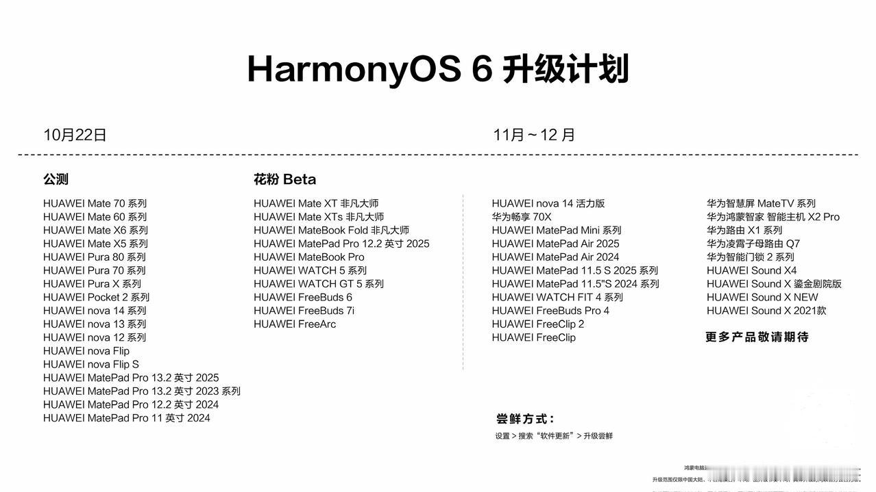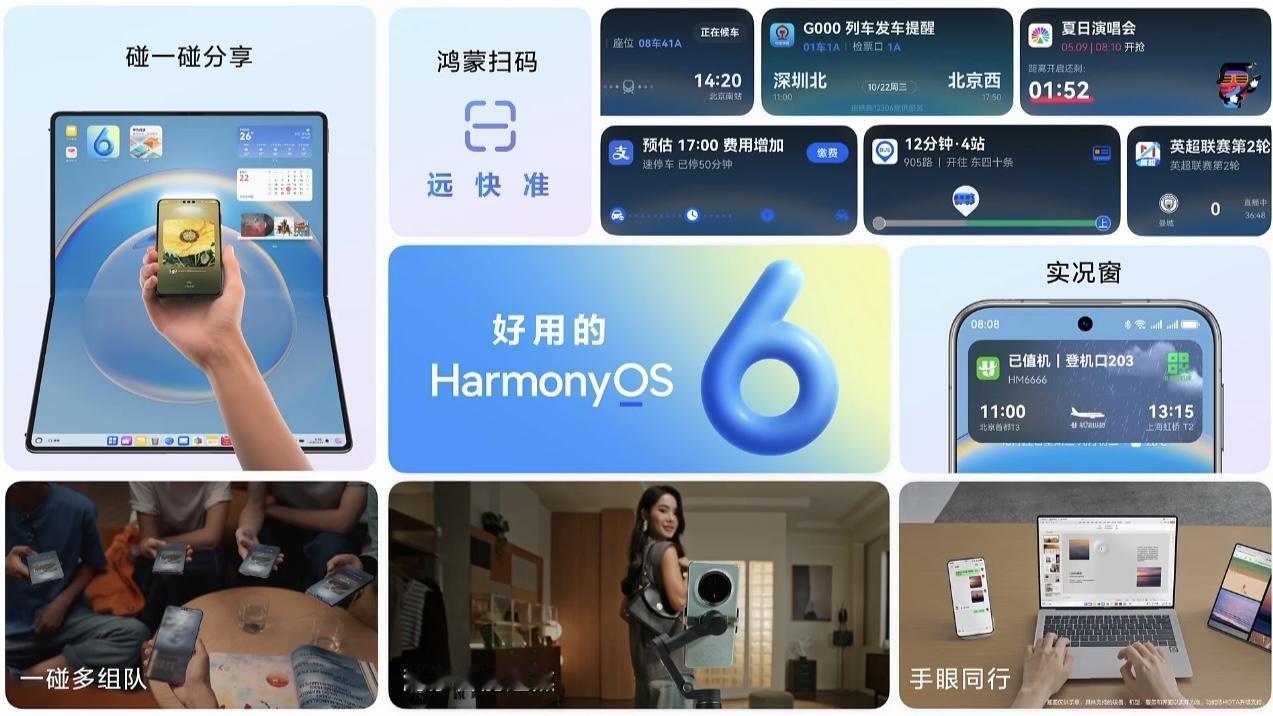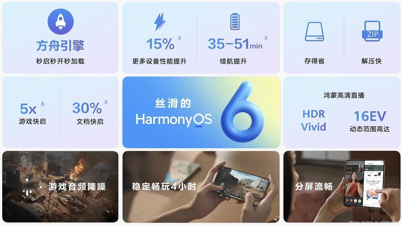 设备提速15%,续航增加35分钟以上,秒启秒开秒加载,防窥加密升级,懂16种方言,游戏启动速度提升5倍,大批智能体上架,支持超过60款碰一碰应用……全新鸿蒙操作系统6大家觉得给力不? 聪明能干、好看好玩、加倍安心的HarmonyOS 6全面解锁,即日起众多机型开启公测,11月开始支持更多机型,详情可看图五。