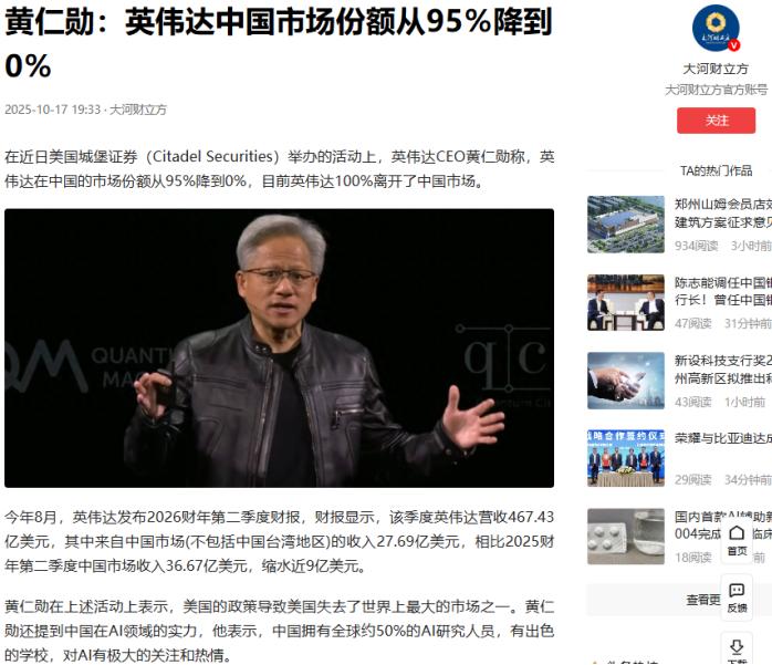 美国的想法是让中国脱钩慢一点,让美国的产业有重建的时间!但美国能卡中国的就立刻停掉,打算直接掐死中国同类产业,把中国变成一个美国产品的倾销地,但是中国怎么可能会让美国的如意算盘得逞呢? 10月6日在Citadel Securities举办的Future of Global Markets2025活动中,黄仁勋表示,英伟达在中国市场的份额从约95%降至0%。原因是美国对中国出口高端AI芯片(如A100、H100、H200)实施了严格的出口管制,使NVIDIA无法向中国相关公司销售这些产品。 但美国没料到,高端芯片的口子刚堵上,中国本土芯片就顺着缺口长了出来。华为昇腾芯片的供应链本土化率已超85%,EDA工具和架构设计早就实现“去美国化”,2025年第一季度在中国市场的占有率已冲到38%,字节跳动单批就订了10万台昇腾910B,连德国超算项目、沙特的芯片订单都开始转向昇腾方案。 英伟达自己的财报也藏不住尴尬,2026财年第二季度中国市场收入比上年同期缩水近9亿美元,所谓“掐死中国芯片产业”的目标,反倒成了中国芯片加速突围的催化剂。 美国想靠产业回流补短板的计划同样磕磕绊绊。为了重建半导体供应链,美国砸了数十亿美元补贴,拉台积电在亚利桑那州建工厂,好不容易造出首枚“美国制造”的Blackwell芯片晶圆,结果封装环节还得运回台积电台湾工厂处理,本土制造能力的短板藏都藏不住。 更现实的是,企业根本不买账,客户不愿为“美国制造”支付更高成本,转头就选了海外更具性价比的方案。 急眼的美国甚至酝酿起新规,要求芯片企业本土生产量与海外进口量必须1:1对等,不然就加征100%关税,可业内早就看透这政策的死穴——供应链的复杂性让关税计算根本没法落地,本土产能又跟不上需求,所谓的“产业重建”更像纸上画饼。 在农业领域,美国想把中国变成农产品倾销地的企图同样落了空。曾经美国大豆在中国市场的进口比重最高达64%,峰值时一年能卖3200万吨,可随着美国把大豆贸易绑上政治战车,中国的采购清单早就换了主角。 2025年5月起,中国对美豆进口彻底归零,连续四个月的装船量都是刺眼的“0.0”,海关总署干脆直接删掉了进口明细表上的“美国”一栏。 取而代之的是巴西、阿根廷、俄罗斯甚至坦桑尼亚的大豆,仅2025年上半年,中国就进口巴西大豆3850万吨,而美豆不足300万吨。 更要命的是美豆连价格优势都没了,2025年上半年美豆进口均价每吨459.8美元,比巴西大豆贵出21美元,这种情况下想靠倾销打开中国市场,简直是异想天开。 美国的每一步算计几乎都被中国的应对精准拆解。高端芯片管制逼出了昇腾的崛起,农产品政治化加速了全球供应链重组,产业回流的补贴砸下去却填不满本土能力的坑。 英伟达失去的95%市场份额被中国本土芯片接住,美国大豆腾出的市场被南美、非洲的供应商瓜分,所谓“慢脱钩换重建时间”变成了“脱钩越快中国替代越快”的尴尬现实。 美国以为卡断供应就能掐死中国产业,却忘了中国市场有足够的体量培育替代方案,更有整合全球资源的能力绕开封锁,这样的情况下,倾销地的美梦自然成不了真。