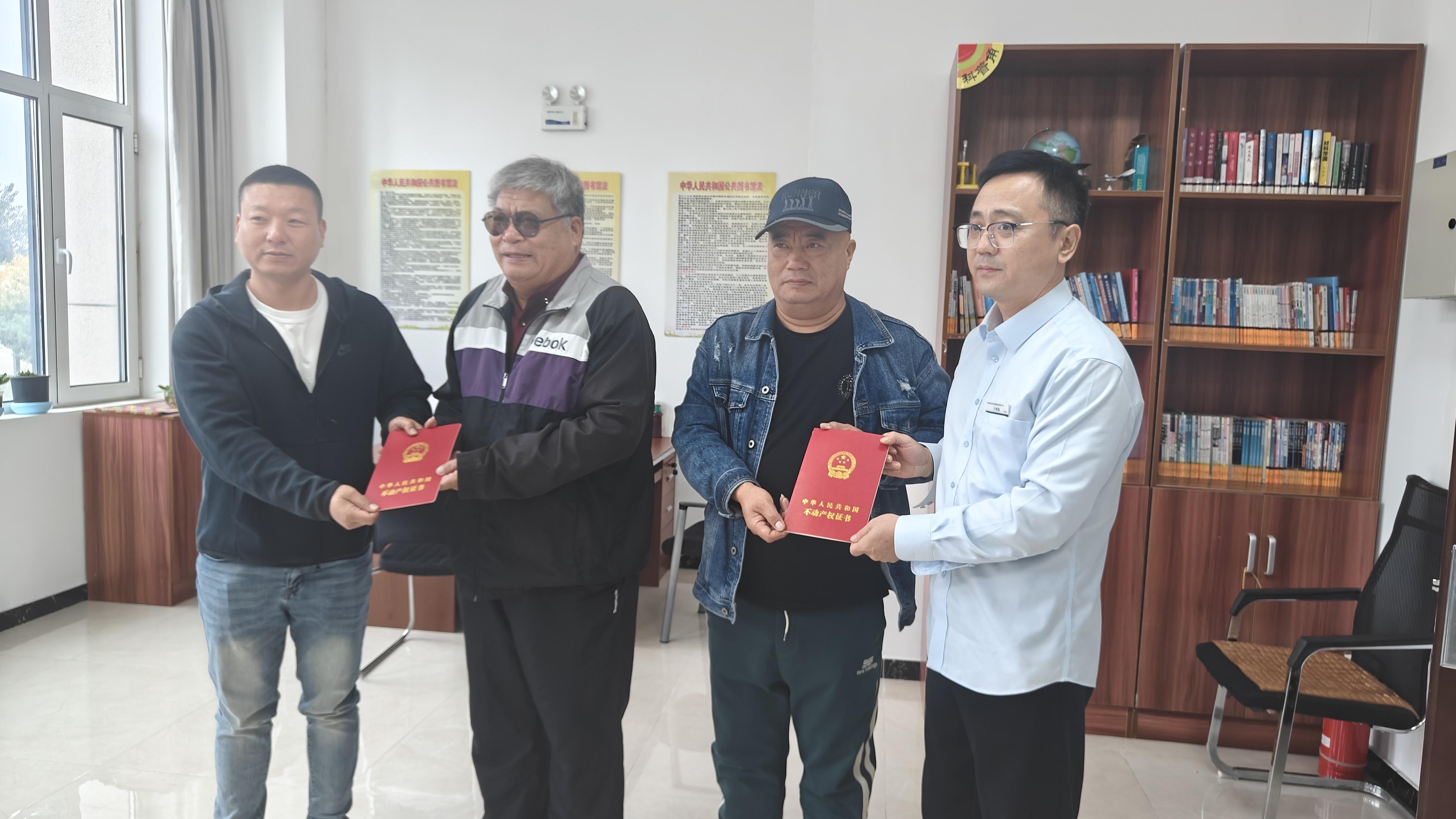 10月17日上午,胜利里社区居委会里洋溢着久违的喜庆气氛。大红色背景板前,居民李善鹏、李善功兄弟从滨海新区不动产登记中心第三分中心工作人员手中接过期盼已久的“红本本”。