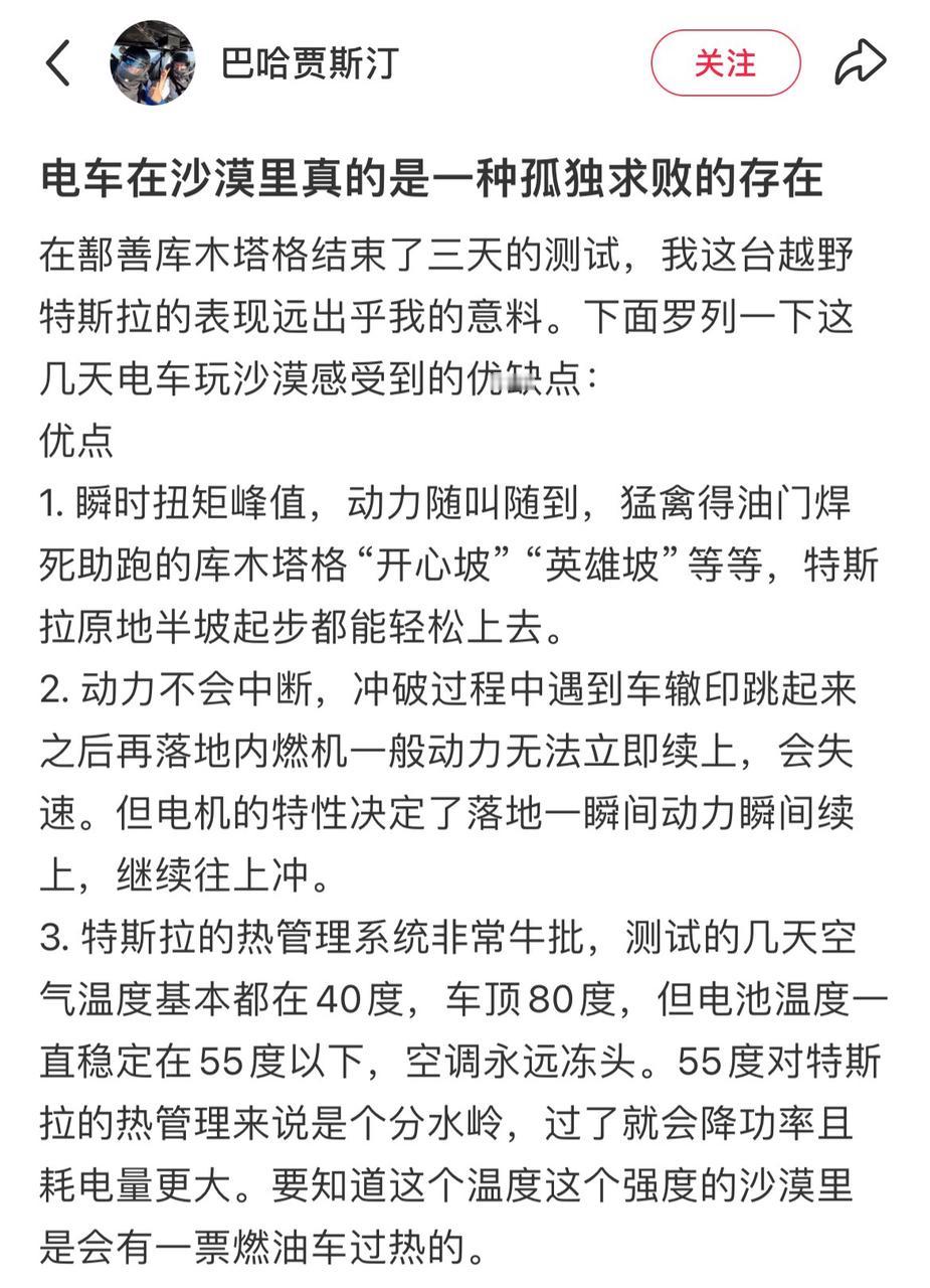 车主“巴哈贾斯汀”的沙漠测试经历,生动验证了这套热管理系统的实力。他在连续三天的沙漠环境测试中分享:“测试期间气温都超过40℃,车顶表面温度更是达到80℃,但特斯拉的电池温度一直稳定在55℃以下,从未出现热失控情况,车内空调制冷也始终保持强劲。”