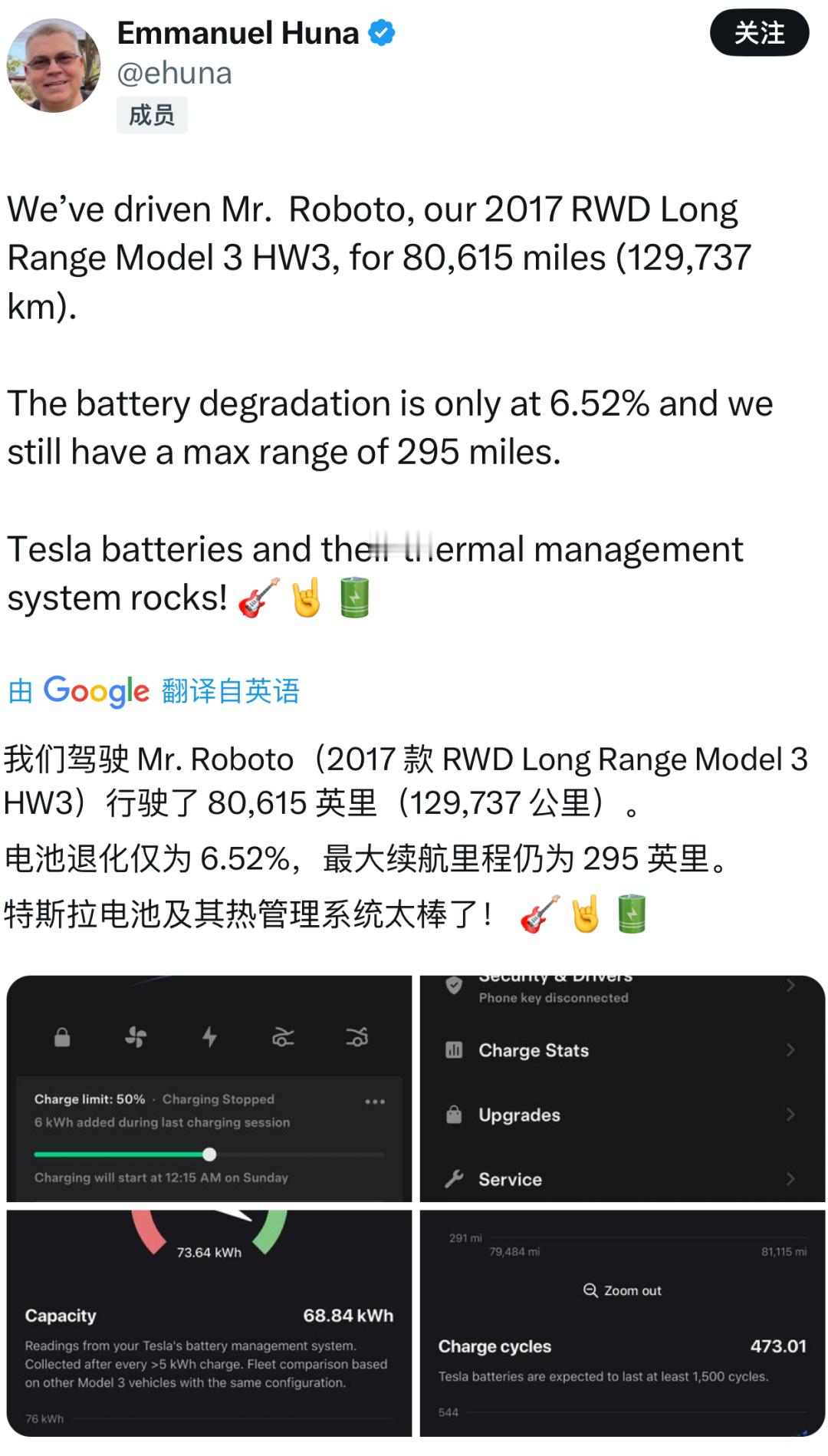 海外Model 3车主“Emmanuel Huna”的用车经历,为这些技术的实际效果提供了进一步佐证。尽管其车辆已行驶8万英里(约13万公里),但电池衰减率仅为6.52%:“车开了8年,电池依然耐用,特斯拉的电池和热管理系统确实出色!”