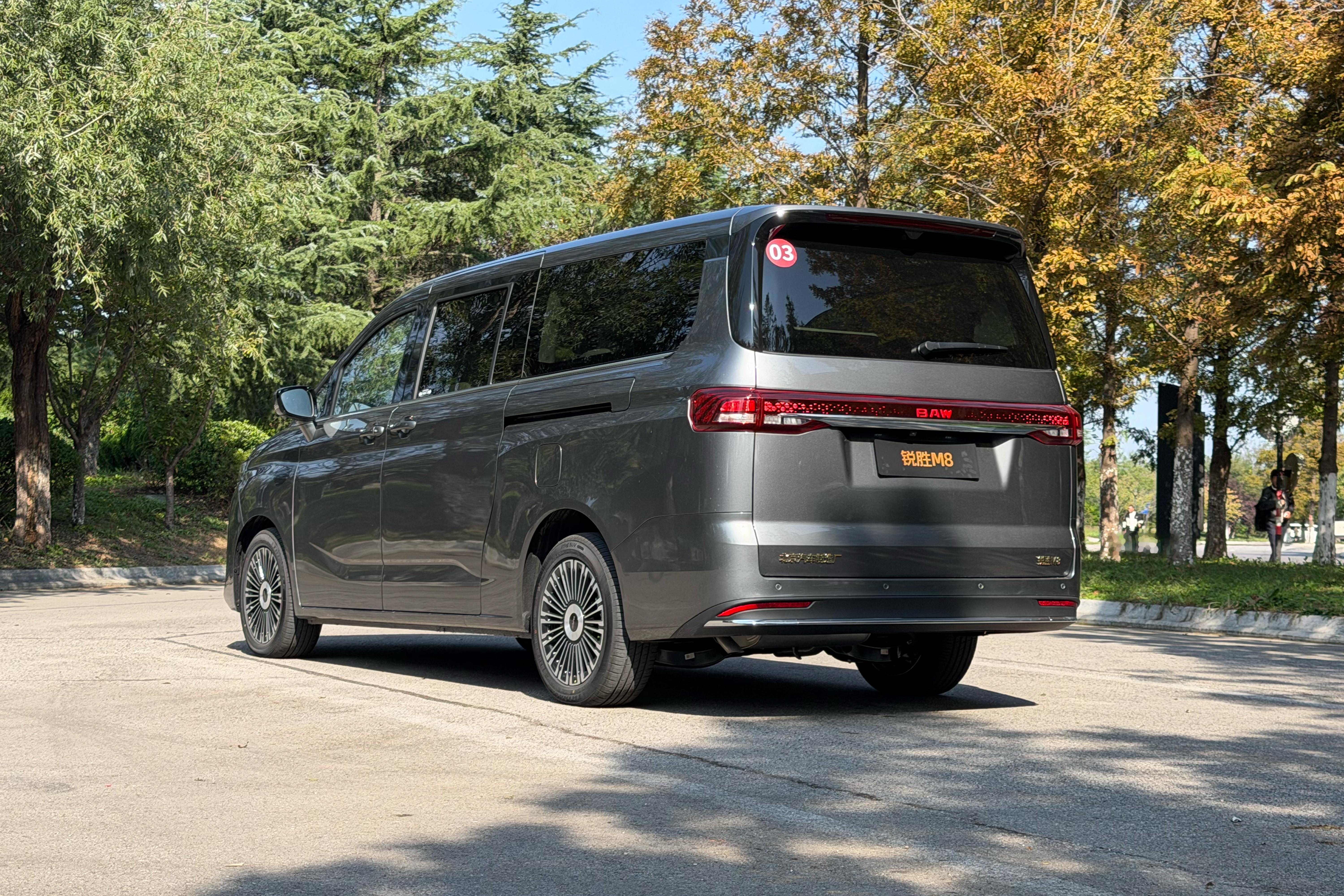 前脸采用双透镜LED大灯组,配合直瀑式镀铬中网与宽幅镀铬边框,营造出威严的视觉张力。车身侧面双侧电动滑门配备可升降车窗,19英寸多辐轮圈提升整车质感。车尾贯穿式尾灯组嵌入镀铬饰条,与后保险杠的横贯式装饰形成呼应,整体造型简洁硬朗,兼顾功能性与美观性。