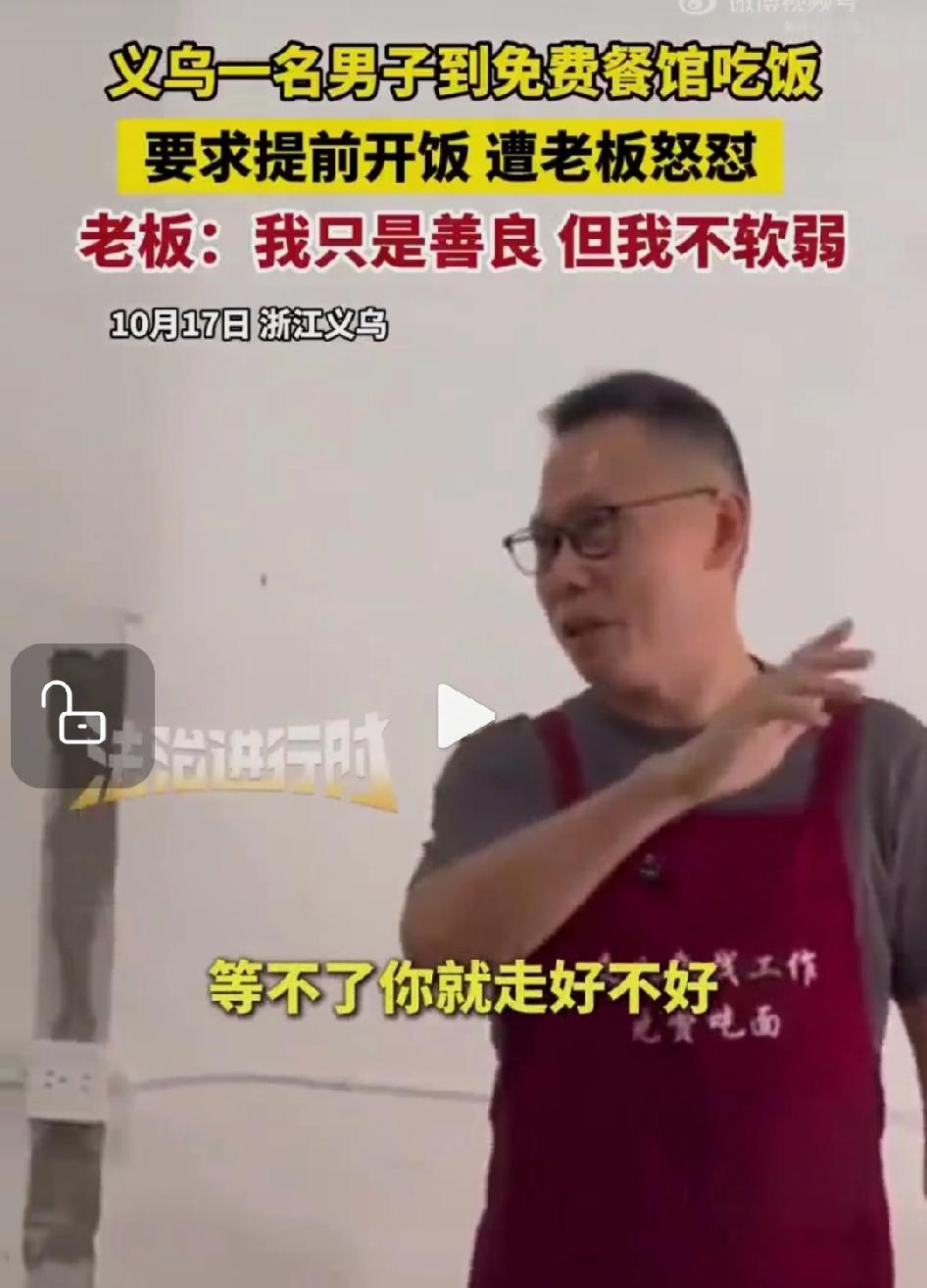 老板说“我只是善良,我不软弱”,“你不是大爷,我也不是店小二”!说中了无数人的心声。 视频中男子大声催开饭,烧快点我都饿了,接着要垃圾袋,语气带着命令让人很不舒服,免费提供饭,又不是伺候你的! 公益不是卑微的讨好,施助者和受助者从来都是平等的,没人该当“大爷”,也没人是“店小二”。 更难得的是老板后续的态度,没有揪着对方的失礼不放,反而替男子解释,可能情绪不受控,体谅他打零工不容易,还主动说事情过去了,恰恰印证了他做公益的初心不是作秀! 从2024年11月开馆到现在,他给环卫工人、快递小哥,还有找工作遇困的人煮了近一年的热乎面,靠的从来不是一时兴起的善良,而是这份发自内心的体谅 。 善意该如何被对待?这些年见过不少类似的争议,有救援队救了人反被索赔,有人享受着免费帮助还挑三拣四 。 就像有网友说的,“饥饿的胃需要填饱,但迷失的心更需找回对善意的敬畏”! 男子后来的道歉,其实也是想明白这个道理,免费的饭菜不代表廉价,别人的好心更不是理所当然!