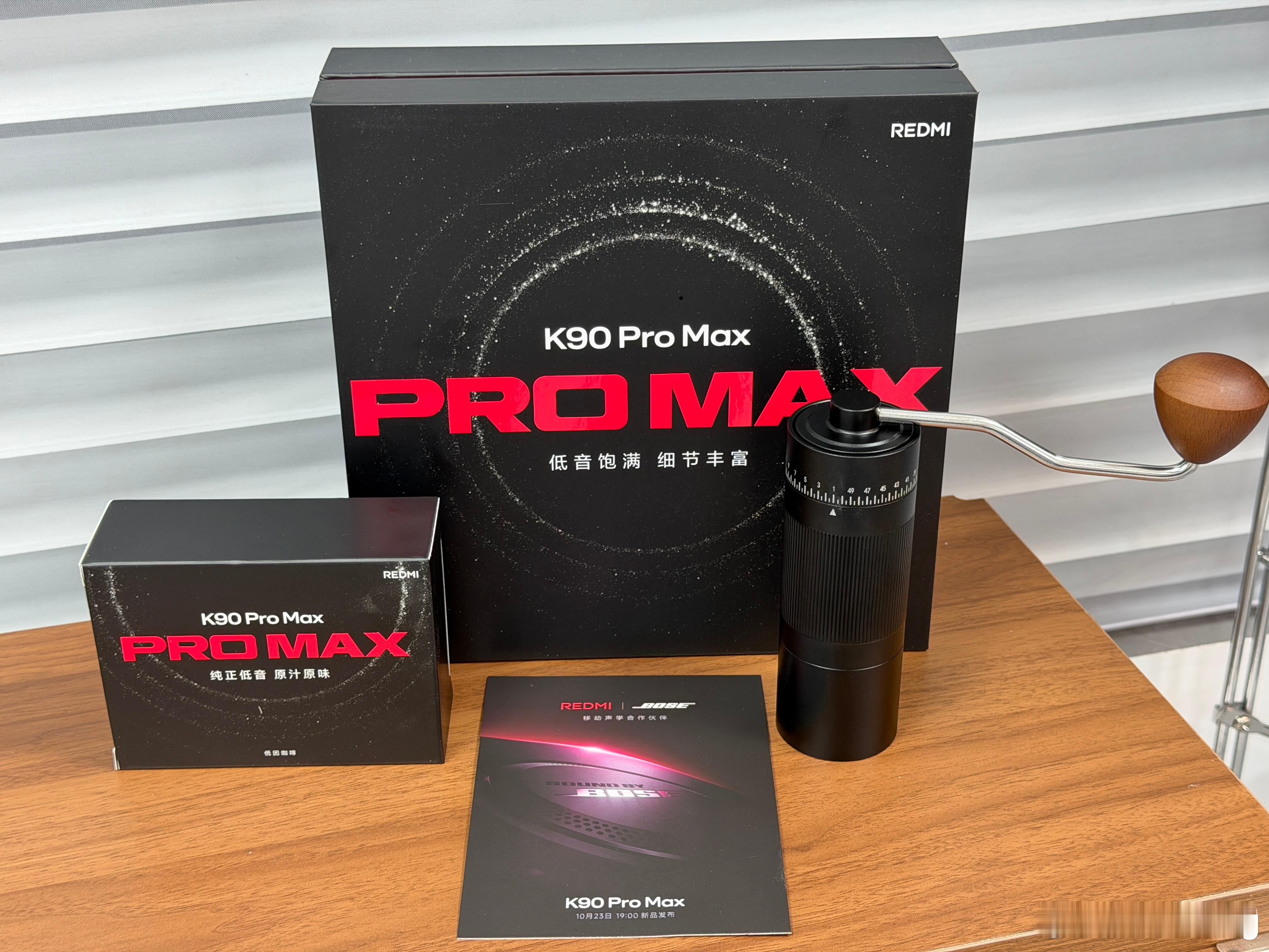 REDMI K90 Pro Max发布会邀请函,里面是一个手摇磨豆机和低因咖啡豆,这是暗示新机低音饱满,原汁原味!