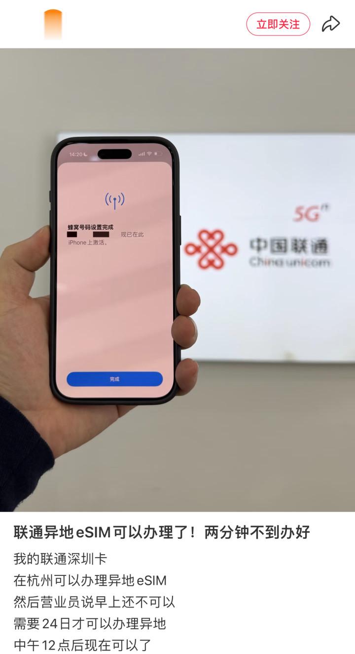 在社交平台上,博主@耳東佳分享了联通eSIM异地办理的新进展:其持有的联通深圳号码,已成功在杭州的联通营业厅完成异地eSIM办理,全程耗时不到两分钟,手机页面也显示“蜂窝号码设置完成”的激活成功提示。该用户还透露,当天上午营业厅工作人员曾表示异地eSIM业务需10月24日才开放,但在中午12点后已可正常办理,这意味着联通异地eSIM服务已提前在部分营业厅落地,为跨地区用户提供了更便捷的办理流程。