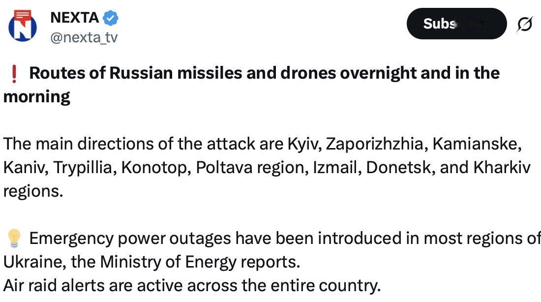 【俄罗斯导弹和无人机大规模夜袭,乌克兰大停电】 10月21日晚上至10月22日凌晨,俄军的空袭又开始了,与此同时,乌克兰的雷达也侦测到搭载“匕首”导弹的米格-31K升空,当天晚上,乌克兰上空狂响空袭警报,根据白俄罗斯媒体(Nexta)的说法,俄罗斯导弹、无人机的夜间路线攻击的主要方向是基辅、扎波罗热、卡米安斯克、卡尼夫、特里皮利亚、科诺托普斯、波尔塔瓦地区、伊兹梅尔、顿涅茨克和哈尔科夫地区,在俄军的猛烈攻击之下,乌克兰大部分地区都发生了紧急停电,而根据白俄罗斯媒体发布的俄军空袭地图看,这次俄军空袭的区域主要集中在基辅以东地区,而乌西地区疑似并未遭到空袭。特朗普强推下的俄乌和平局能成吗 这次俄军猛攻乌克兰的电力能源设施,这不禁令人猜测:随着冬季的即将来临,俄军是否将重拾2022年冬季的战术,让乌克兰经常遭遇“大停电”,从而打压乌克兰社会的韧性,消耗乌克兰的防空资源。 记得2022年,尽管乌克兰完成了2次成功的秋季反攻,但之后却经历了非常难熬的冬天,苏洛维金制定了“猛攻乌克兰能源设施”的战术,俄军的“天竺葵”经常让乌克兰断水断电,不过在2023年和2024年冬季,俄罗斯并未祭出这一战术,而今年的情况特殊,乌克兰猛攻俄罗斯炼油厂,不排除俄罗斯会针对性报复。