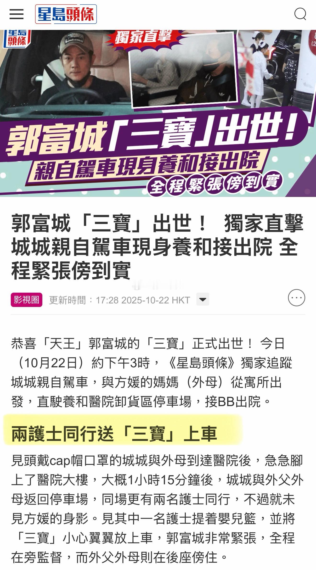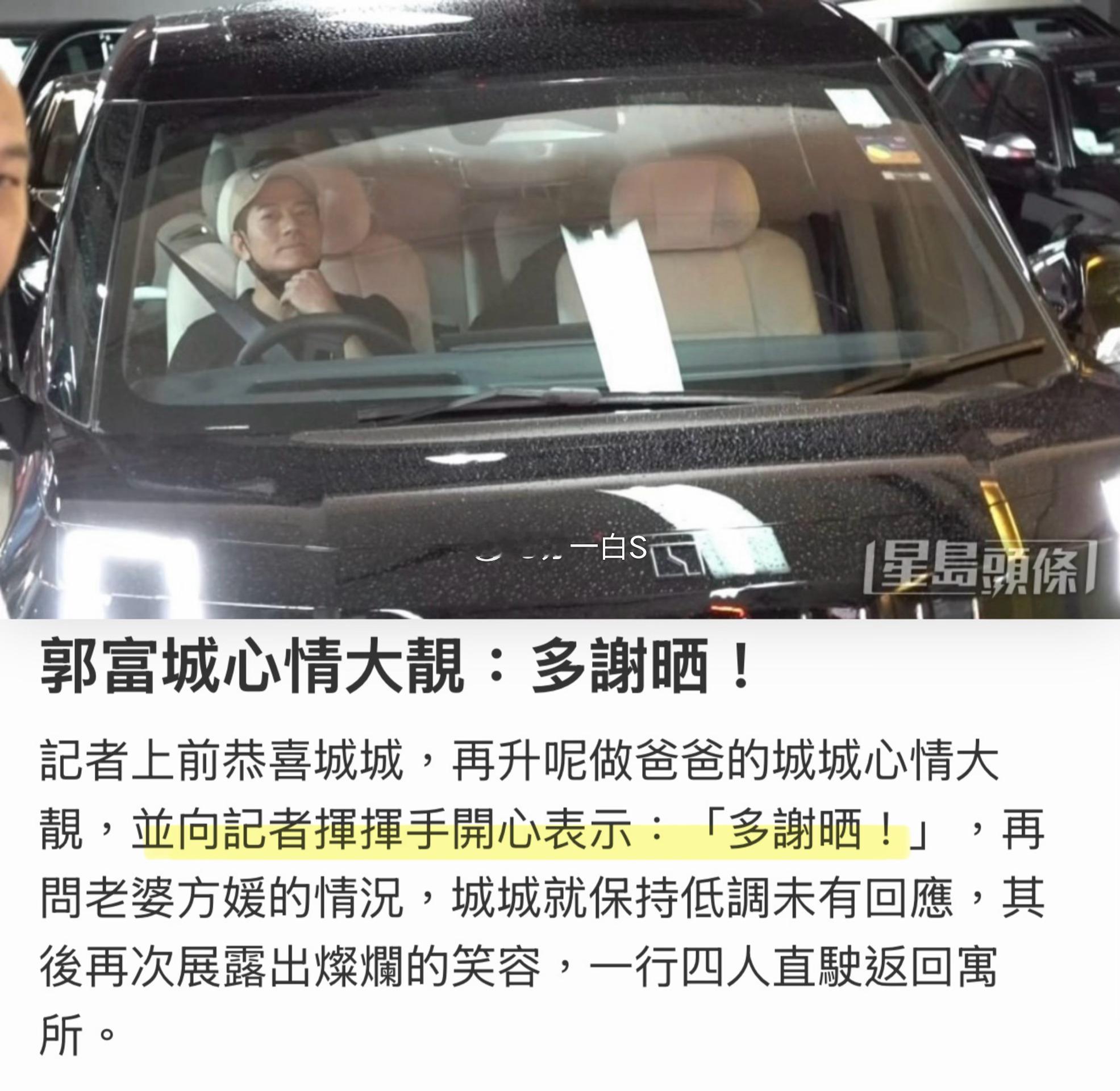 郭富城被拍到亲自开车现身养和医院接“三宝”回家,车子后排坐着方媛的爸妈。面对蹲守的记者,郭富城笑着挥手回答,“多谢!”