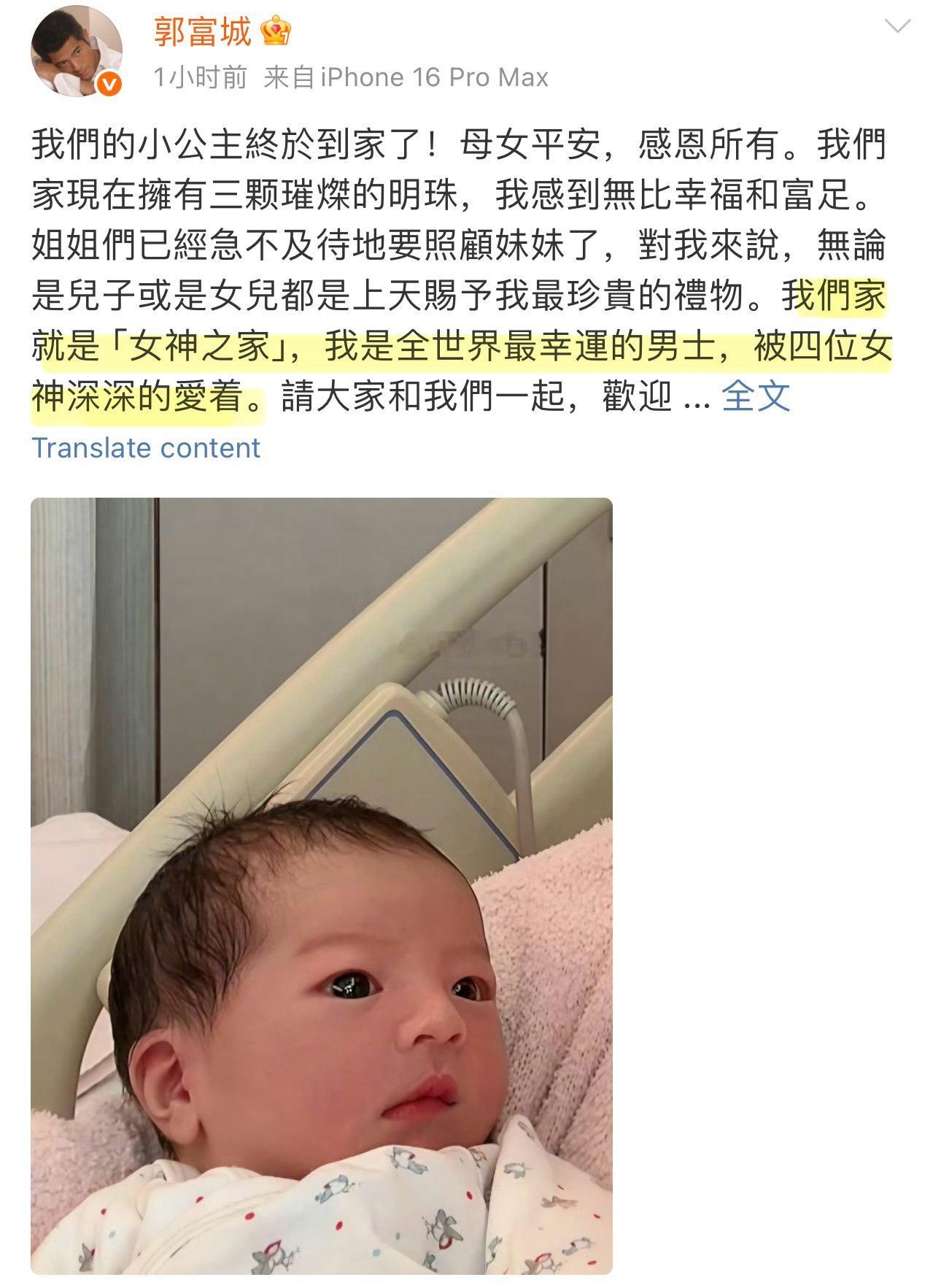 【更新图四】郭富城发微博官宣第三胎是个妹妹[给你小心心]“母女平安,感恩所有”,“无论儿子或女儿都是上天赐予我最珍贵的礼物”,“我是全世界最幸运的男士,被四位女神深深地爱着”[心]