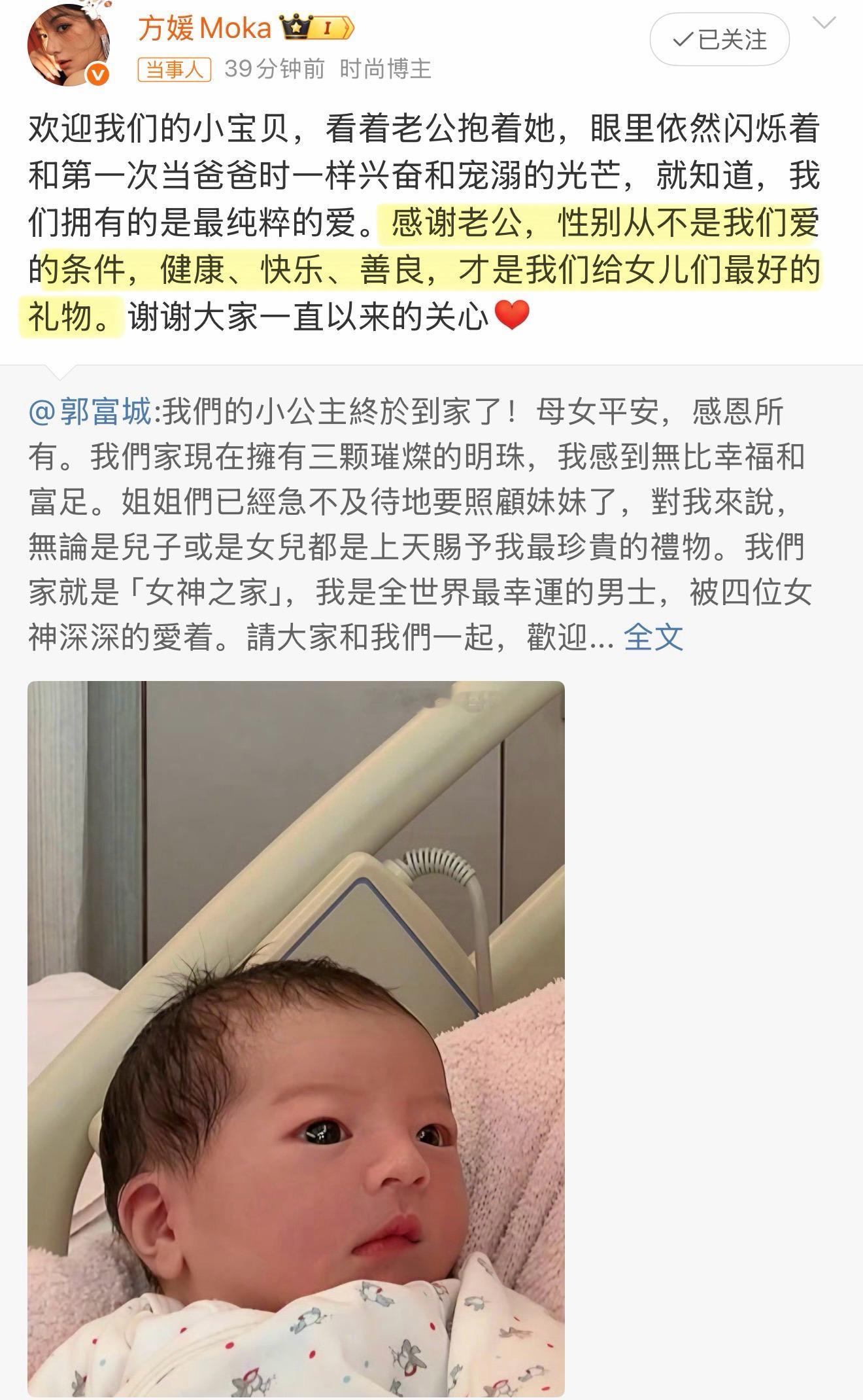 【更新图五】方媛也转发了,“欢迎小宝贝,看着老公抱着她,眼里依然闪烁着和第一次当爸爸时一样兴奋和宠溺的光芒,就知道,我们拥有的是最纯粹的爱。感谢老公,性别从不是我们爱的条件,健康、快乐、善良,才是我们给女儿们最好的礼物。谢谢大家一直以来的关心[心]”方媛生三胎后发文