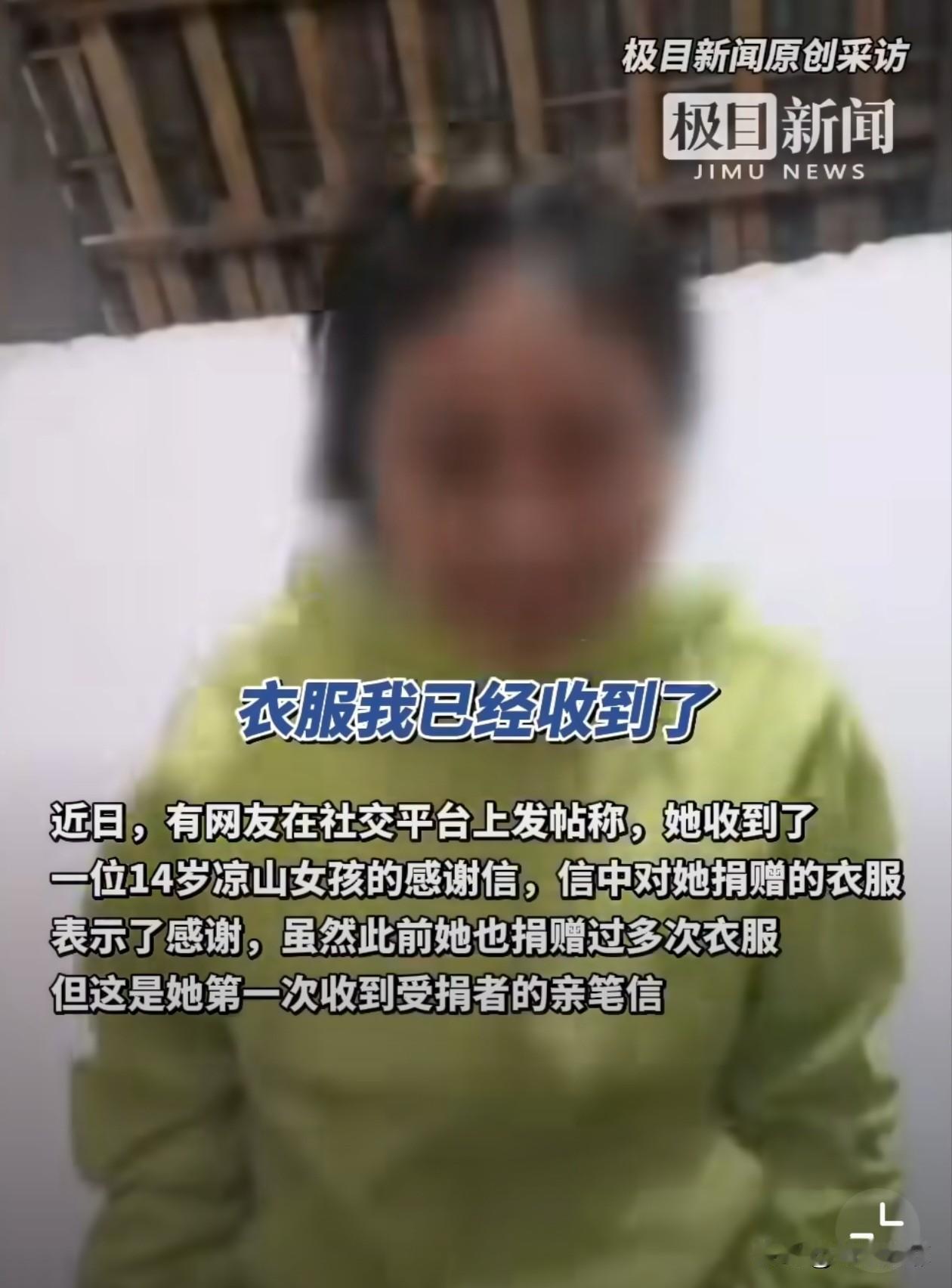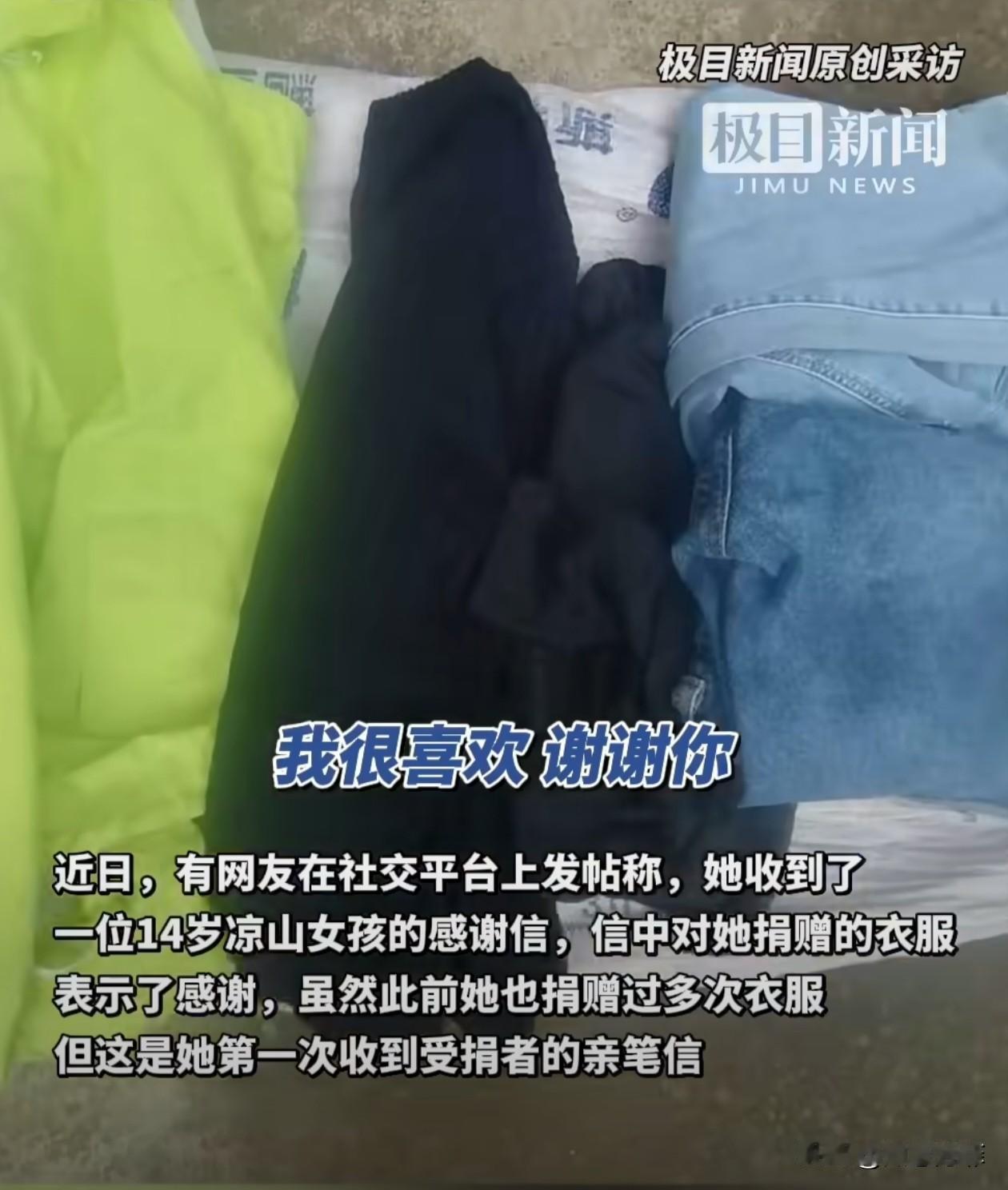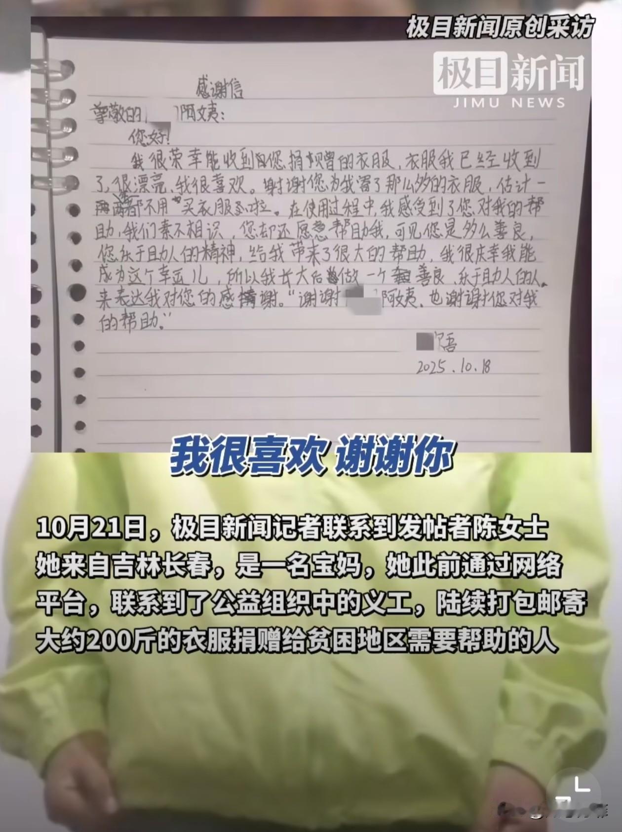 女子家里攒了200多斤自己和孩子的旧衣服,她觉得扔了可惜,于是全部捐给了有需要的人,之后竟收到了3000公里外14岁女孩的亲笔信和感谢视频。女子感叹:收获了巨大的温暖与爱的回流。 吉林,女子是一位宝妈,家里攒下了她和10岁儿子的不少旧衣服,扔了可惜,留着又占地方,就通过公益组织捐了出去,想送到真正有需要的人手里。 女子前前后后打包邮寄了大约200斤衣服,其中有20多斤自己穿的衣服。 这些衣服跨越3000公里,到了四川凉山14岁的女孩阿伍手上。巧的是,阿伍和女子身高体重差不多,衣服穿着特别合身,她开心的说一两年都不用买新衣服了。 阿伍家里困难已经辍学,为了感谢女子,她特意拍了穿新衣服的视频,还写了封亲笔信,说“衣服很漂亮,谢谢您”,承诺长大后也要做善良的人 。 女子收到信和视频当场看哭了,这是她第一次收到受捐者的回应,觉得所有付出都值了。 她还许愿,希望阿伍能早日重返校园,将来穿着这些衣服走进大学。 女子的善举很实在,她不是跟风捐赠,而是真心不想浪费闲置衣物,还特意找能反馈去向的公益组织,这份真诚让善意不敷衍。 阿伍收到合身的衣服后,没觉得理所当然,反而特意拍视频、写亲笔信,用最朴素的方式回应,让人感动。 3000公里的距离,素不相识的两个人,因为衣服结下缘分,很奇妙,也很温暖。
