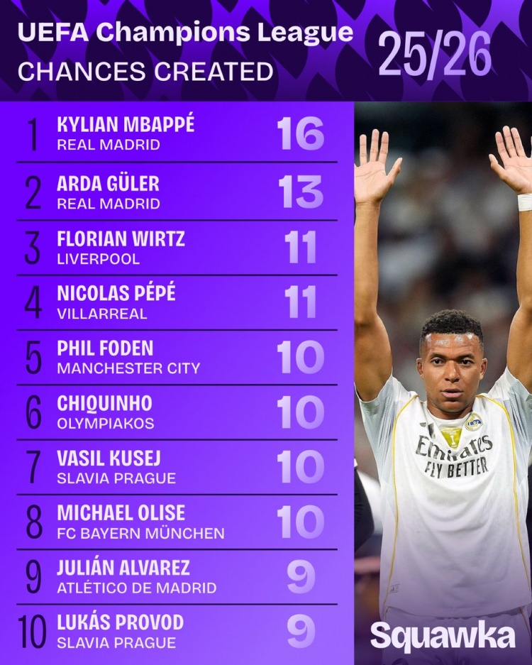 直播吧10月23日讯Squawka统计了本赛季欧冠目前为止的创造机会排行榜,姆巴佩位列第一,队友居莱尔第二,维尔茨第三。