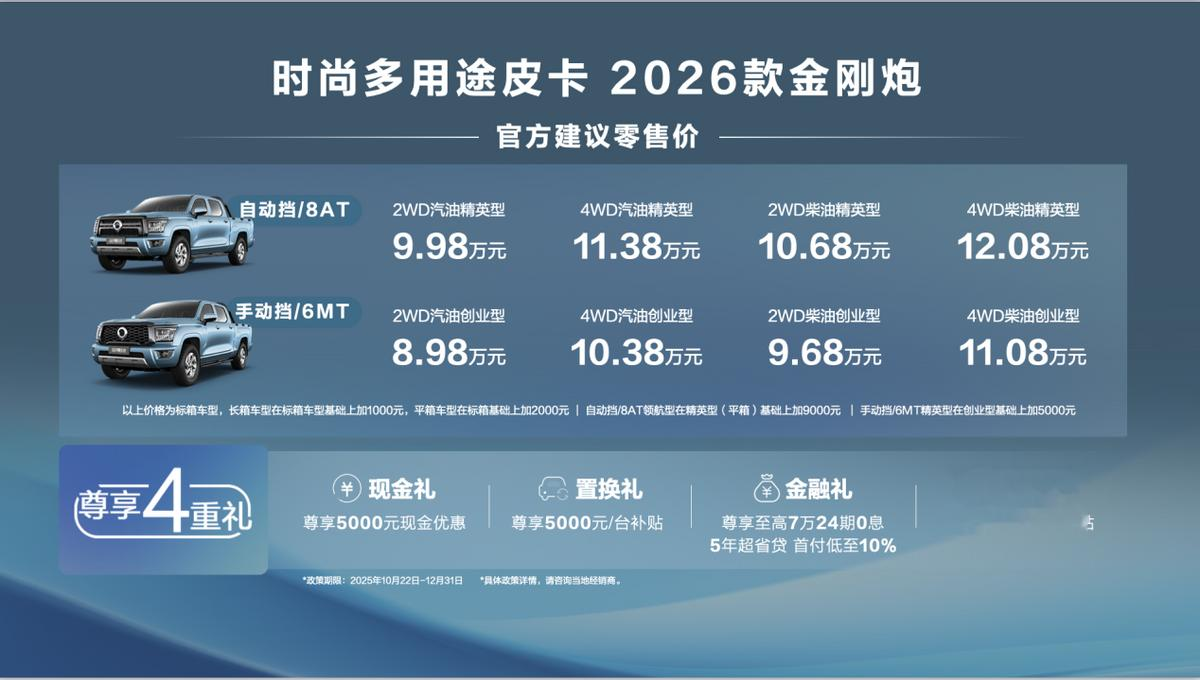 10月22日,时尚多用途皮卡——2026款金刚炮在荆门智慧工厂焕新上市。金刚炮8AT车型,官方建议零售价9.98万元起;金刚炮6MT车型,官方建议零售价8.98万元起。并同步推出5000元现金礼、5000元置换礼、2000元老友礼以及7万24期0息金融补贴四重豪礼。