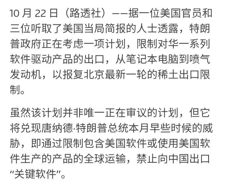 中美经贸博弈路透社:据一位美国官员和三位听取了美国当局简报的人士透露,特朗普政府正在考虑一项计划,限制对华一系列软件驱动产品的出口,从笔记本电脑到喷气发动机,以报复北京最新一轮的稀土出口限制。