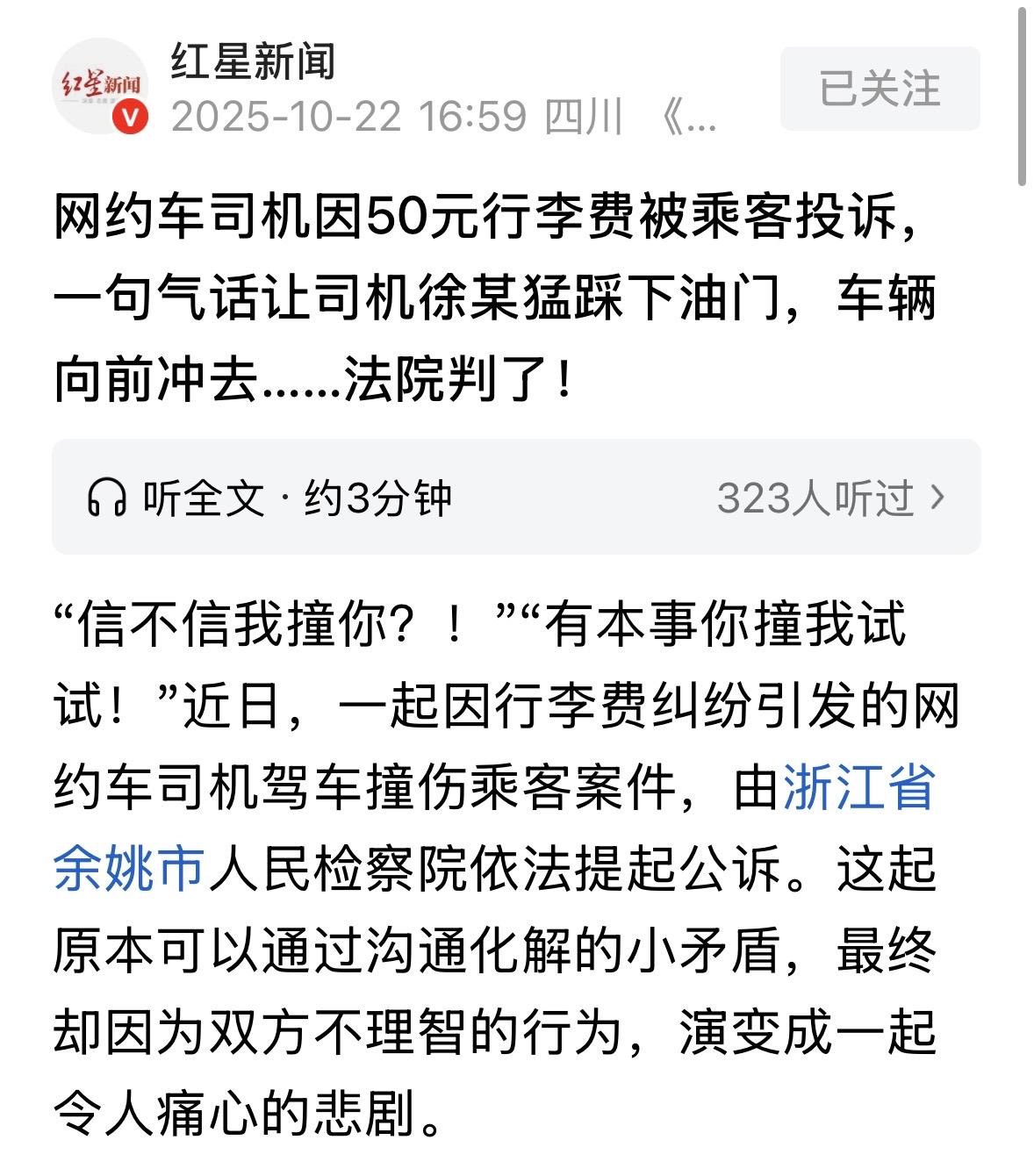 浙江余姚,一工人带着大行李箱和一卷床铺,打了辆顺风车回工地上班,司机看到行李箱后面露不悦,说还要接别的乘客,行李放不下,让工人加50块行李费,否则走不了,工人觉得被宰了,拍下车牌号扬言要投诉,司机见状怒从中来,大喊信不信我撞你?工人不甘示弱,说有本事你就撞!谁怕你?司机脑子一热,一脚油门撞飞工人,还连带撞坏了两辆车,结局让司机后悔莫及。 2023年的一个早晨,建筑工人老石急着赶回杭州的工地上班,他带着一个大行李箱和一个卷起来的床铺,打了辆网约拼车。 早上8点,网约车司机徐某按订单到达约定地点。当他看到老石拖着的硕大行李箱和卷成筒状的床铺时,眉头瞬间拧成了疙瘩。 徐某开口吐槽道:你这行李也太多了!等会我还要接顺风车拼单的客人,他们行李往哪塞?要不你再加50块行李费吧,否则我没法拉。 老石一听就急了,他争辩道:后备箱里本来就有你自己的杂物,凭什么让我多掏钱?这不是明摆着宰客吗?我要投诉你! 两人你一言我一语,吵得不可开交,徐某觉得这单生意接得窝火,干脆掏出手机取消了订单,开始动手卸下老石的行李。 老石见状更是火冒三丈,他冲到车头前掏出手机对准车牌拍照,准备留下投诉的证据。 然而,这个举动彻底点燃了徐某的怒火,他拍着方向盘吼道:信不信我撞你? 老石也正在气头上,梗着脖子顶回去:撞啊!有本事你撞! 谁也没料到,这句气话竟成了现实。 徐某突然猛踩油门,轿车如离弦之箭窜了出去。老石被撞得腾空飞起,重重摔在几米外的水泥地上。 除此之外,气头上的徐某还连带撞坏了路边停放的两辆私家车。 撞人后的徐某瞬间清醒过来,他手忙脚乱地拨打了110和120。 经医院诊断,老石全身多处骨折。他左侧股骨粉碎性骨折,腰椎横突断裂,骨盆多处骨折,伤情经法医鉴定为轻伤一级。 这起因50元行李费引发的冲突,最终演变成刑事案件。 法庭上,徐某的辩护律师提出他具有自首情节,且案发后积极施救,但检察官指出,徐某作为网约车司机,本应具备更高的情绪管理能力,其冲动行为造成严重后果,必须承担法律责任。 老石躺在病床上回忆事发经过时,仍心有余悸。他说自己当时只是气不过想拍个车牌号投诉,哪知道司机真的敢开车撞人。 这场意外不仅让他错过了工期,还要承受长期康复的痛苦。更让他寒心的是,事故发生后,网约车平台仅垫付了部分医疗费,后续赔偿问题至今没有妥善解决。 徐某承认自己当时被愤怒冲昏了头脑,以为对方只是说气话,没想到真的会撞人。 他说自己每天开车十几个小时,压力大、收入不稳定,那天早上又急着接下一单,情绪突然失控酿成大错。 有人说,顺风车乘客,没备注大件行李,司机可无责任取消订单,因为你带了大件行李,司机就没办法接其他乘客,就会损失50元!所以如果想要司机继续接你,那乘客确实要支付所谓行李费,司机就可以少接一个人了!如果乘客不同意,司机是可以取消订单的。 也有人认为,司机和乘客都没有错,错在平台抽佣太高,导致单价过低,司机才会要求加钱,如果有合理的价格,司机不可能会要求加钱,也不会有这样子的悲剧发生,所以,网约车平台要治理一下,刻不容缓。 那么,从法律角度,怎么看待徐某的行为? 《刑法》第234条规定:故意伤害他人身体的,处三年以下有期徒刑、拘役或者管制。致人重伤的,处三年以上十年以下有期徒刑。 网约车司机徐某与乘客老石因50元行李费发生争执,徐某在盛怒之下驾车撞击老石致其轻伤一级,法院审理认为,徐某已构成故意伤害罪。 徐某在争吵后说出"信不信我撞你",并实际踩油门撞击老石,他的行为已超出一般争执范畴。 尽管徐某声称"只是气话",但从客观行为与结果的因果关系看,他主观上具有伤害故意,符合"故意伤害他人身体"的构成要件。 根据法医鉴定,老石损伤程度为轻伤一级。依据规定,故意伤害致轻伤的量刑幅度为"三年以下有期徒刑、拘役或者管制"。 徐某在案发后主动报警、留在现场等候处理并协助救治伤者,构成自首情节。根据《刑法》第67条,自首可从轻或减轻处罚。 但是,徐某的暴力行为直接危及公共安全,他撞坏两辆汽车且造成被害人多处骨折,社会危害性较大,因此法院在量刑时未进一步减轻处罚,而是选择在法定刑幅度内从重裁量。 作为网约车司机,徐某负有安全运送乘客的法定义务。其因琐事冲突采取危险驾驶行为,不仅违反交通运输管理法规,更突破服务从业者的职业底线。 法院最终以故意伤害罪判处徐某有期徒刑一年四个月。宣判时,法官特别强调:作为服务行业从业者,网约车司机更应保持理性克制,任何以危险方式危害公共安全的行为都将受到法律严惩。 所以说啊,出门在外,互相多份理解多好,何至于闹到这般田地?在快节奏的生活中,学会控制情绪、理性沟通,比争一时之气重要得多。 对此,你怎么看? 关注@运良说法. 学法律知识不迷路