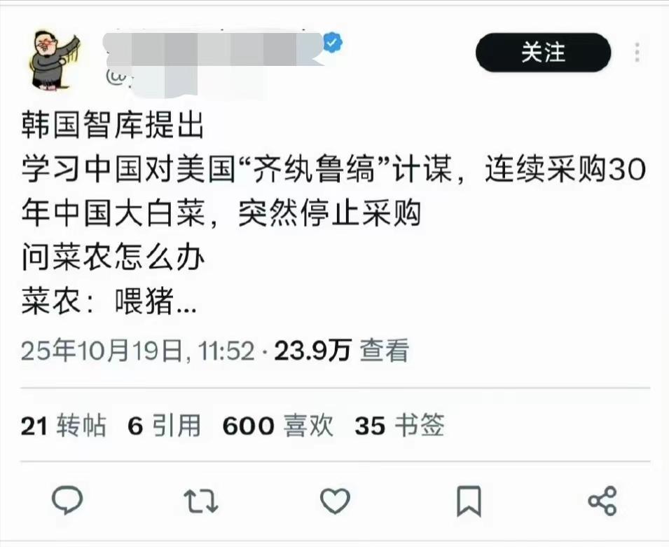韩国要对中国的大白菜玩"齐纨鲁缟"的战略? 所谓"齐纨鲁缟",说的是春秋时期齐国靠控制鲁国布料贸易来打压对手的办法,最近美国因为我们不买他们的大豆了急的直跳脚,我们用得也是类似的办法。 现在韩国智库想照葫芦画瓢,计划连续30年狂买中国的白菜,等咱们习惯后突然停购,妄图以此拿捏中国蔬菜产业。说白了就是想先当"大客户"稳住我们,等我们形成依赖后突然撤单,让中国白菜卖不出去,可这番盘算从一开始就打错了算盘。 首先得搞清楚,现在的国际贸易可不是古代小国家之间的生意,体量差得太远了,这是最关键的问题。美国之所以能被我们"拿捏"住,也是因为我们大豆的采购量占美国出口比重一度能达到六成,没了我们美国大豆短时间根本找不到买家了。 而根据我农业农村部的最新数据,2024年中国白菜总产量有1.02亿吨,如果按韩国全年200万吨的白菜消费量算,咱们一年的产量够韩国吃50多年。 韩国能从中国买多少白菜呢?韩国关税厅统计显示,2024年才买了5.3万吨,占中国总产量的比例还不到0.05%,相当于1000斤白菜里只少了半斤,对整个中国白菜市场来说几乎掀不起波澜。 中国蔬菜流通协会调研也说了,国内蔬菜市场的调节能力特别强,光是把白菜做成泡菜、酸菜,或者当成饲料喂猪,这两个渠道就能轻松消化掉这5万多吨的出口缺口,韩国就是停购个百八十年的,这"齐纨鲁缟"的战略也玩不成。 更重要的是,韩国自己对中国白菜的依赖程度,也比表面看起来要高得多。 韩国农林畜产食品部的数据显示,韩国每年大概吃200万吨白菜,自己能种190万吨,看似95%都能自给自足,但一到冬天蔬菜淡季,就必须靠进口补缺口。 而中国因为离得近、价格又实惠,占了韩国白菜进口市场92%的份额。要是韩国真敢突然不买中国白菜,短期内也找不到这么多替代货源。日本和东南亚的白菜产量本来就有限,运到韩国的运费还比中国贵不少,到时候韩国国内的白菜价格还得疯涨。 2010年韩国就因为天气不好,白菜减产,当时一棵白菜能卖到上百元人民币,不少家庭连泡菜都吃不起,引发了全国性的"泡菜危机",最后还是靠紧急从中国进口才缓解,这段历史就说明韩国的白菜供应其实很脆弱。 除此之外,中国白菜产业早就不是只靠鲜卖一条路了,多元化的发展让单一国家的订单变化影响不了大局。现在中国的白菜除了新鲜吃,大部分还会用来加工——像我们平时吃的酸菜、泡菜、脱水蔬菜干,很多都是用白菜做的,还有些品质稍差的白菜会直接当成饲料了。 说到底,韩国智库只看到了美国大豆的例子,却没看清贸易的实际情况,我们不是依赖单一买家的小国,而是拥有庞大产能和多元市场的农业大国。这个构想,既没看到中韩农业规模的巨大差距,也低估了中国市场的调节能力,更没考虑到自己可能面临的白菜涨价、泡菜断供风险。 在全球化的今天,只有抱着合作共赢的心态,才能把生意做长久,妄图用几千年前的老办法来"拿捏"中国,最后只能是竹篮打水一场空,根本行不通。