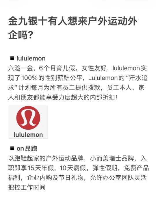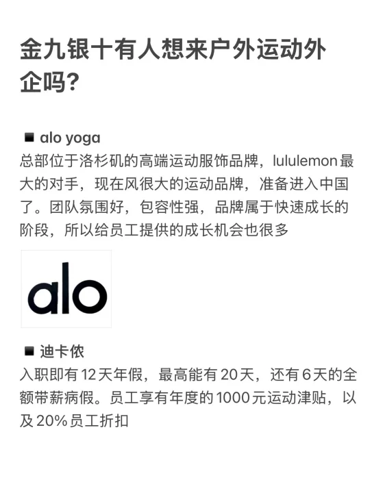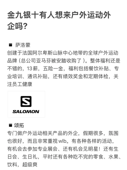金九银十求职季还在看传统行业?建议大家去看看这些户外运动外企,真的香疯了,有超香的员工内购,氛围还好大家经常一起爬山露营玩飞盘 . 为什么建议大家去试试运动外企? 🎯内购价入手顶级装备,装备补贴+运动课程免费上,15-20天超长年假,还有专属“户外假”,不卷不加班,下班直接进山 . 户外运动越来越火,这些年外企业务蹭蹭涨,现在入职正好赶上发展快车道 . 坚持日更✊🏻,帮大家在找工作路上顺利拿到offer! .