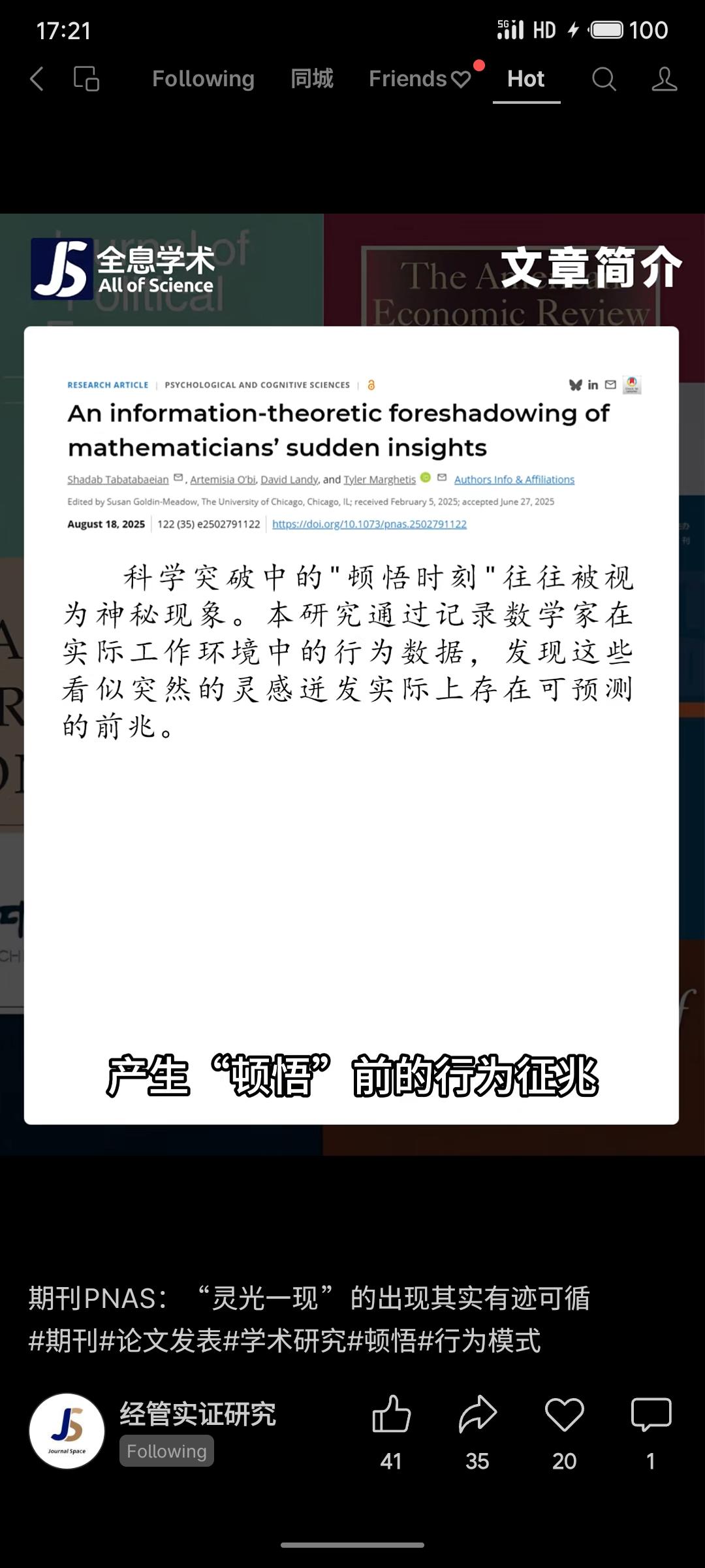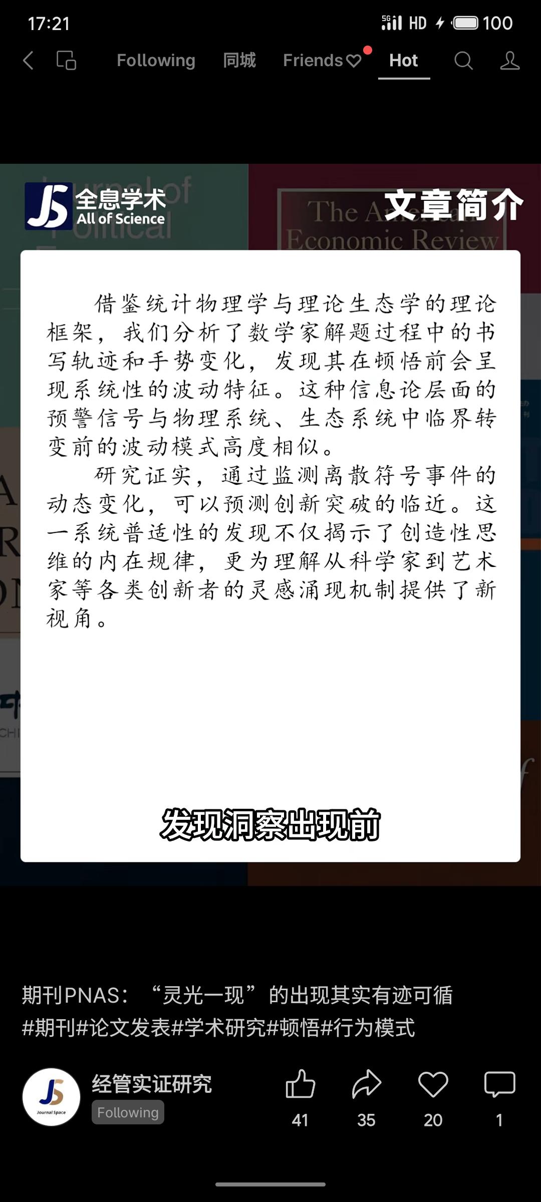 一项研究发现,数学家“顿悟”前的书写和手势会呈现可预测的波动模式,类似物理或生态系统临界转变前的信号。通过监测行为变化,可预判灵感涌现,揭示创造性思维的普遍规律。