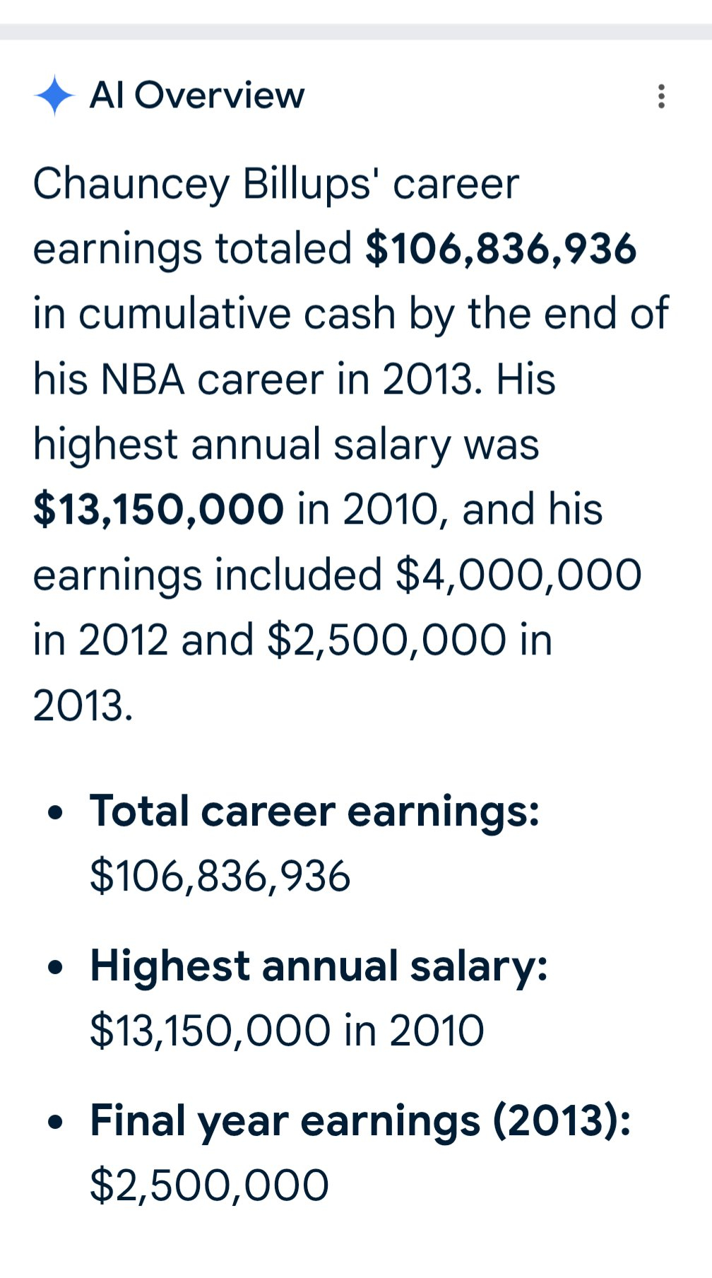 其职业生涯总收入为106,836,936美元,截至2013年NBA生涯结束。