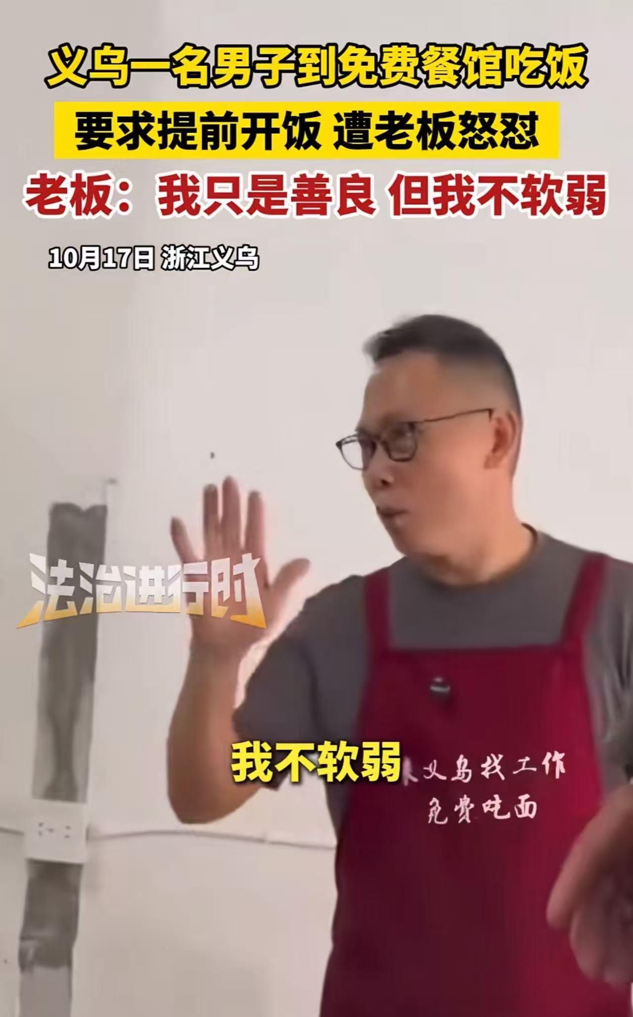 义乌,一名男子到免费餐馆吃饭,要求提前开饭,遭老板怒怼:“我只是善良,但不是软弱,吃免费的饭还把自己当大爷了……”网友:老板怼得好!这种人不是遇到困难,是好吃懒做!吃免费的还那么硬气,惯的! 10月16日,浙江义乌的一家爱心小餐馆,只要你生活有困难,就可以免费来吃饭,不用有任何心理负担。 李老板(化名)的这家餐馆,已经默默经营了三年,每天清晨,他都会起早,亲自做饭,只为给那些拾荒者、务工人员和独居老人送上一碗热腾腾的饭。 他每天准备三十多份餐食,保证每一个来的人都能吃到热饭,哪怕迟到了一些,也会为他们留着。 李老板的这份努力,有时间、劳动力、金钱的付出,更重要的是,他所付出的还有一份无形的爱心。 那天,一位中年男子走进了这家小馆子,他穿着干净整洁的衣服,看起来并不像是生活困难的人。 他来到店里,理直气壮地催促老板快点做饭,理由很简单:他饿了,说得毫不客气,好像老板欠他一样。 他甚至顺手拿走了墙上挂着的两卷印有公益标志的垃圾袋,认为这也是免费的一部分。 在他的认知里,既然是免费餐馆,那么一切都应该是理所应当的,他想得到一切他想要的东西,对于他来说,免费就等于可以无所顾忌地要求,不需要任何回报。 面对男子的咄咄逼人,李老板并没有选择妥协,而是冷静回应:“我只是善良,不是软弱。” 他告诉对方,免费并不意味着可以无理要求,更不意味着别人就是你的服务员,李老板并不需要什么高额的回报,但他需要的,是一份基本的尊重,至少一个“谢谢”。 这场口角被人拍下迅速传播开来,很多网友看到后,都纷纷支持李老板的立场,他们指出,那个男子看起来衣着整洁,显然并不是真的生活困顿,他更像是一个习惯性占便宜的人。 而李老板的强硬态度,不仅保护了他的尊严,也筛选掉了这种投机取巧的人。 这场风波虽然激烈,却也让李老板更坚定了自己的信念,事后,他的小店依然如常营业,没有因为这场争执而停滞。 这反而证明,遇到“烂人”,并没有让李老板失去善意,反而让他的善良更加有力,保护善意的底线,才能让这份善意走得更远,也让更多真正需要帮助的人受益,为李老板点赞。 信源:法治进行时