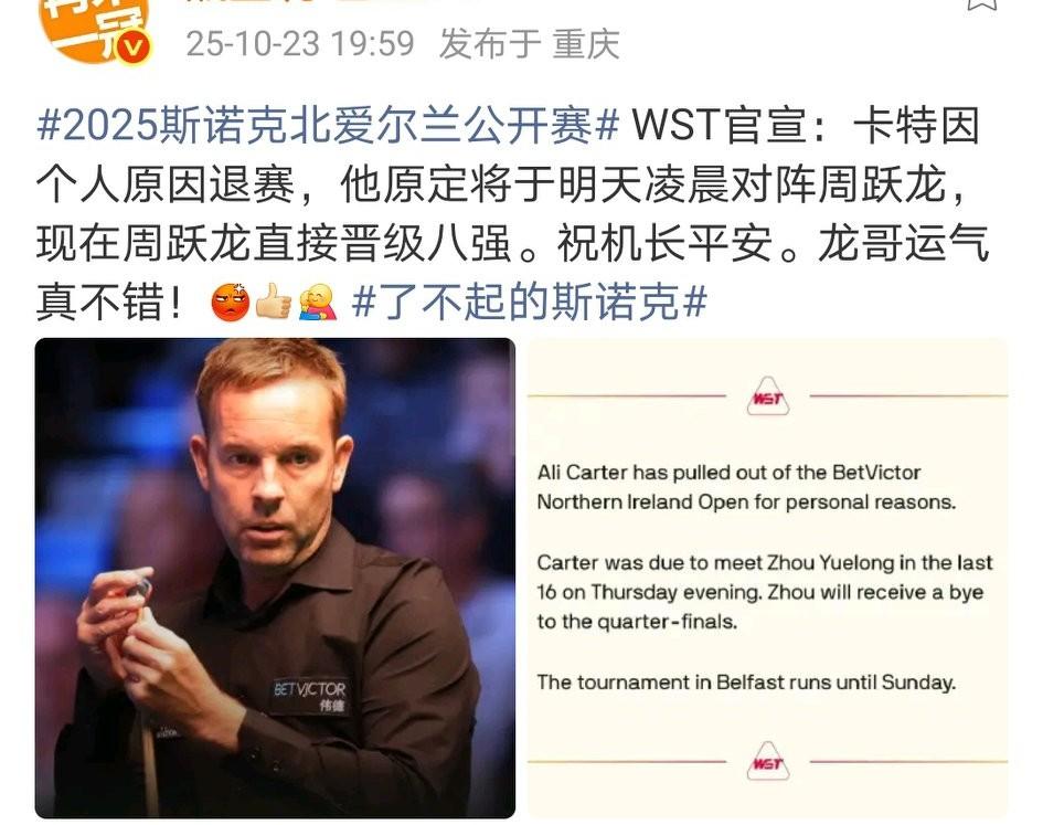 如果不是卡特临时退赛,中国球员真的会全军覆没……2025斯诺克北爱尔兰公开赛16进8: 周跃龙—卡特(退赛,周跃龙轮空晋级) 袁思俊2-4汤姆福德 斯佳辉1-4希金斯 国强2-4凯伦威尔逊 另外特鲁姆普、艾伦均已顺利晋级八强。