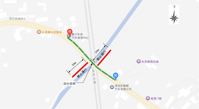 因茂名市北组团主干路网新建工程(一期)—省道S280线改建工程(东环大道)(一期)工程施工需要,为保障车辆通行安全有序,国道G325线K407+509m羊角镇深水田桥往西方向100米至库卡车房汽车美容中心、往东方向100米至茂名市雄顺汽车商行范围,大塘边至深水田桥50米范围,深水田路口至国道325路口50米范围,进行封闭施工。