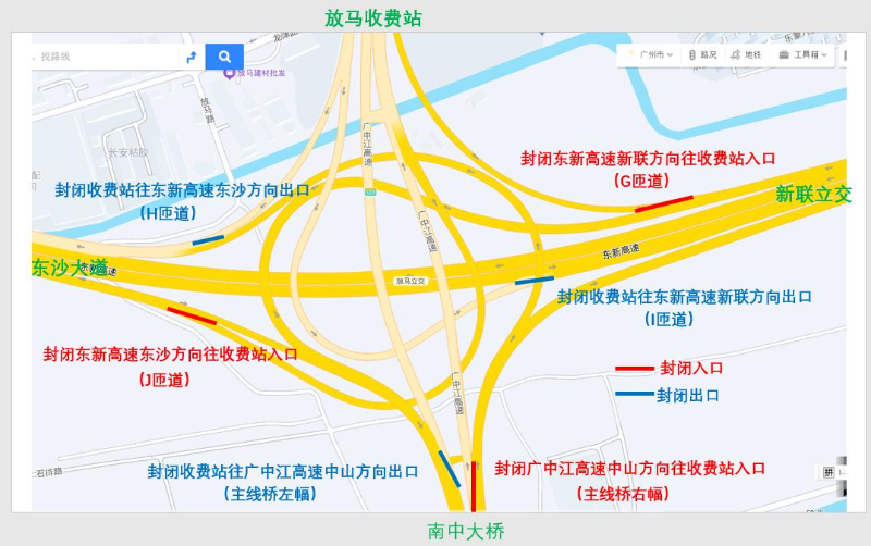 因狮子洋通道与广中江高速衔接段项目施工需要,广中江高速主线往放马站方向匝道出入口、东新高速东沙大道方向和新联立交方向往放马站匝道出入口实施全封闭,禁止车辆通行。
