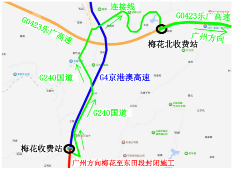 京港澳高速往广州方向车辆:从京港澳高速梅花收费站出→G240国道往湖南方向→连接线→乐广高速梅花北收费站进入→往广州方向。