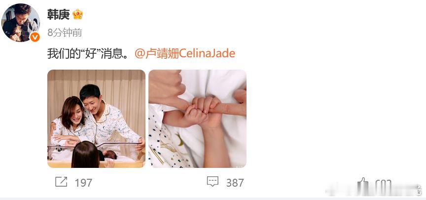 韩庚卢靖姗官宣得子韩庚和卢靖姗官宣二胎儿子,还晒出一家四口握手照,好幸福啊
