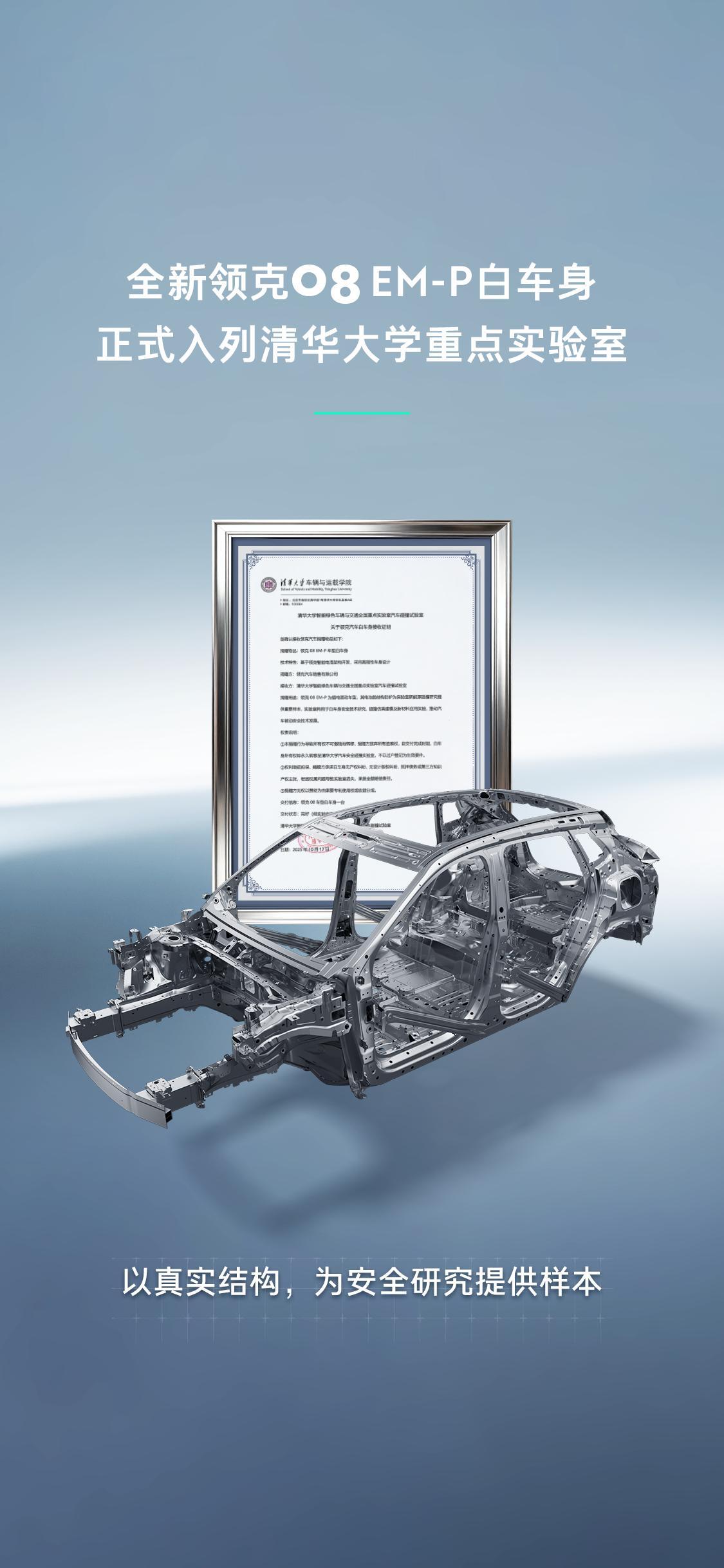 领克向清华碰撞实验室捐赠了一台领克08白车身,用于安全研究教学。