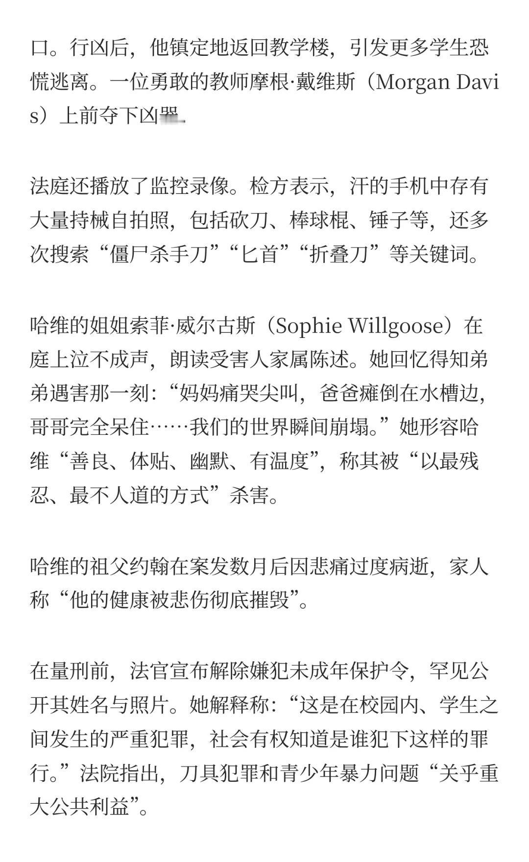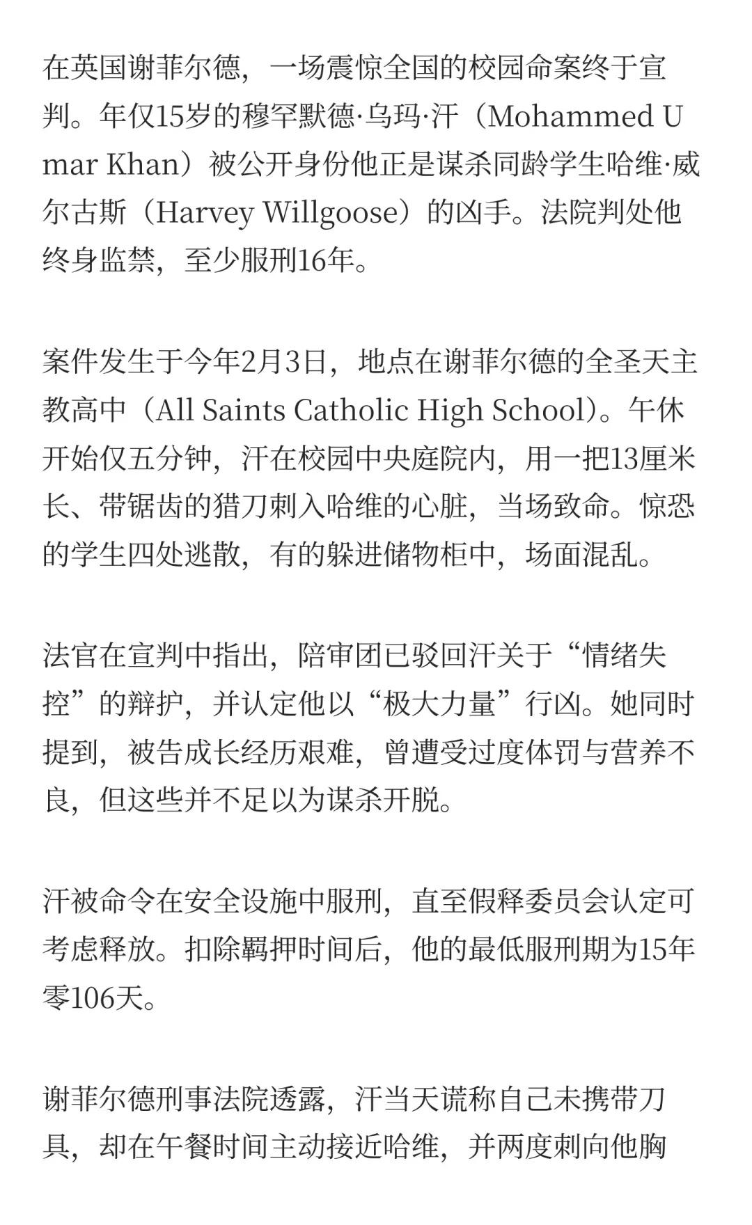 英国谢菲尔德一场震惊全国的校园命案终审 在量刑前,法官宣布解除嫌犯未成年保护令,罕见公开其姓名与照片。她解释称:“这是在校园内、学生之间发生的严重犯罪,社会有权知道是谁犯下这样的罪行。”法院指出,刀具犯罪和青少年暴力问题“关乎重大公共利益”。曼彻斯特 新闻 生活 伯明翰 英国工作 英国留学生 海外 伦敦生活 伦敦 英国