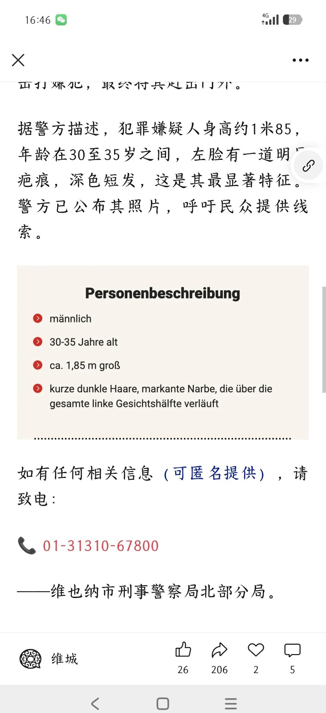 维也纳警方通缉令 模拟画像专家林警官今天根据《皇冠报》报道,为维也纳警方绘制了犯罪嫌疑人模拟画像,希望能帮助案件早日破获。如果有见过此人或掌握线索的市民,也欢迎协助完善画像。奥地利生活 奥地利 国际 坚决打击犯罪