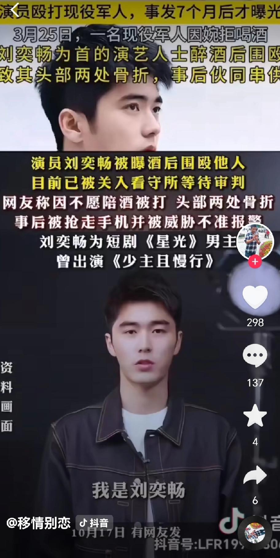 刘奕畅彻底凉透!围殴军人砸酒瓶还串供,1亿违约金都救不了他 28岁艺人刘奕畅这回是真的栽了,而且栽得彻底——因酒后围殴现役军人,他不仅被关进看守所等审判,演艺生涯更直接被宣判“死刑”。 事情起因只是一场聚会的劝酒被拒。现役军人梁先生因身份特殊礼貌回绝后,刘奕畅瞬间翻脸,带着吴崇轩、杨浩等同行艺人对其围殴。更恶劣的是,他抄起洋酒瓶猛砸对方太阳穴,酒瓶碎裂后还想拿碎片攻击,有人甚至用皮带勒住梁先生脖颈致其濒临窒息。最终梁先生两处骨折、听力永久性下降,被鉴定为轻伤二级,伤势堪比严重车祸。 施暴后刘奕畅的操作更显嚣张:抢走手机阻止报警、建群串供编造“互殴”谎言,还放话“没钱办不到的事”威逼谅解,甚至恐吓受害者未婚妻致其失业。更讽刺的是,他3月打人,4月还炒作恋情,10月主演网剧仍正常开播。 直到受害者上报部队,这张“关系网”才彻底崩塌。法律亮剑后,行业迅速切割:代言品牌28小时内发解约函,违约金高达代言费200%;主演的《星光》等剧集连夜下架,六部待播剧因他面临AI换脸或重拍,损失超12亿。算上各项违约金,他已背上近亿债务,即便出狱也难逃赔偿。 公众人物的特权思维,终究敌不过法律的铁拳。如今刘奕畅被羁押待审,同伙取保候审,等待他们的不仅是刑事处罚,更是行业永久封杀的结局。