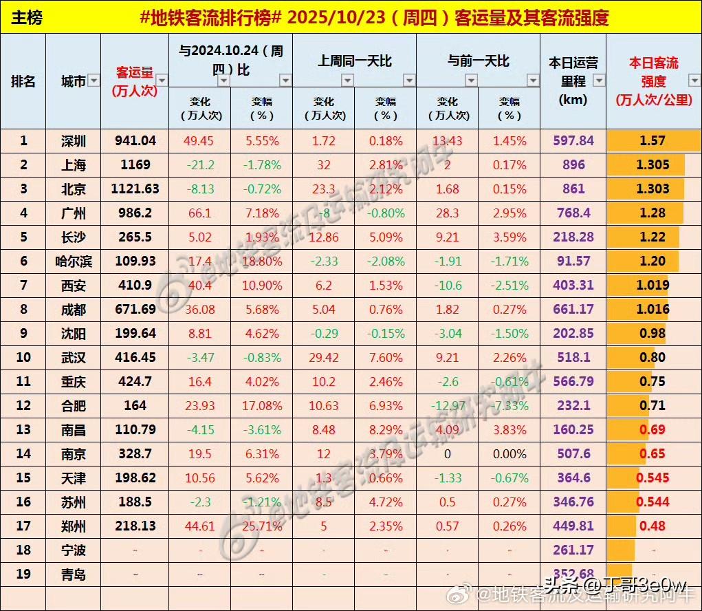 重庆、武汉和西安周四地铁客流量同时达到400万人次以上[呲牙][呲牙][呲牙] 爆料 身边事 10月23日(星期四) 全国城市地铁客流量排行榜: 上海1169.0万 北京1121.63万 广州986.20万 广州地铁 深圳941.04万 深圳地铁 成都671.69万 重庆424.70万重庆身边事 武汉416.45万武汉地铁 西安410.90万 西安身边事 南京328.70南京地铁 长沙265.50万 长沙身边事 郑州218.13万郑州爆料 沈阳199.64万 天津198.62万天津身边事 苏州188.50万 合肥164.0万合肥爆料 青岛110万+ 宁波110万+宁波身边事 南昌110.79万江西南昌身边事 哈尔滨109.93万