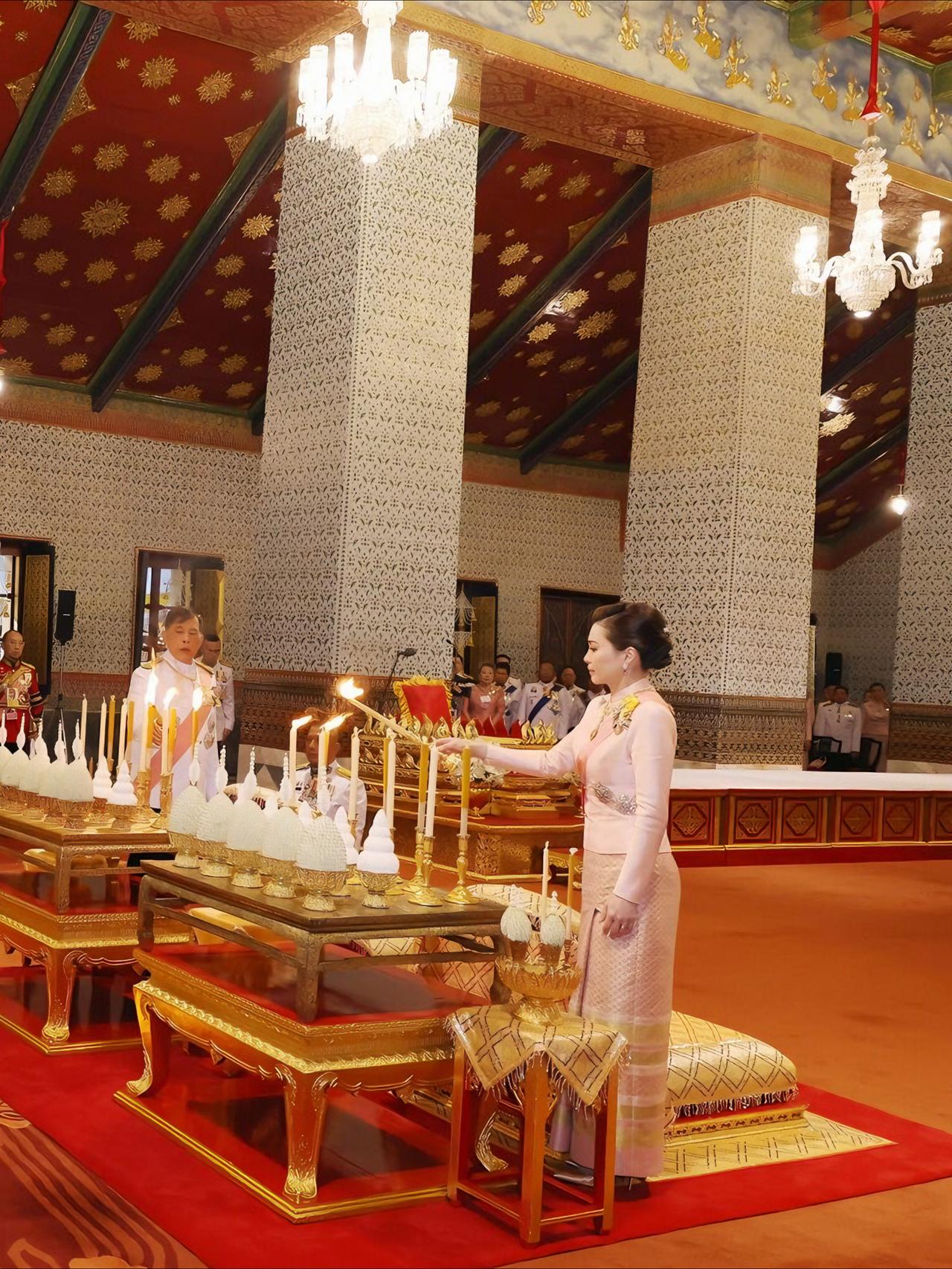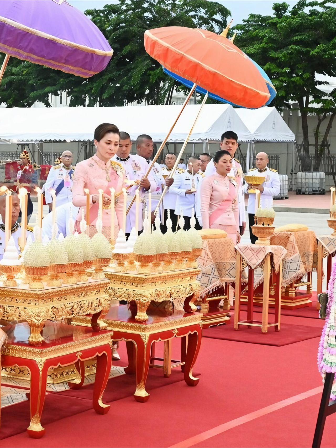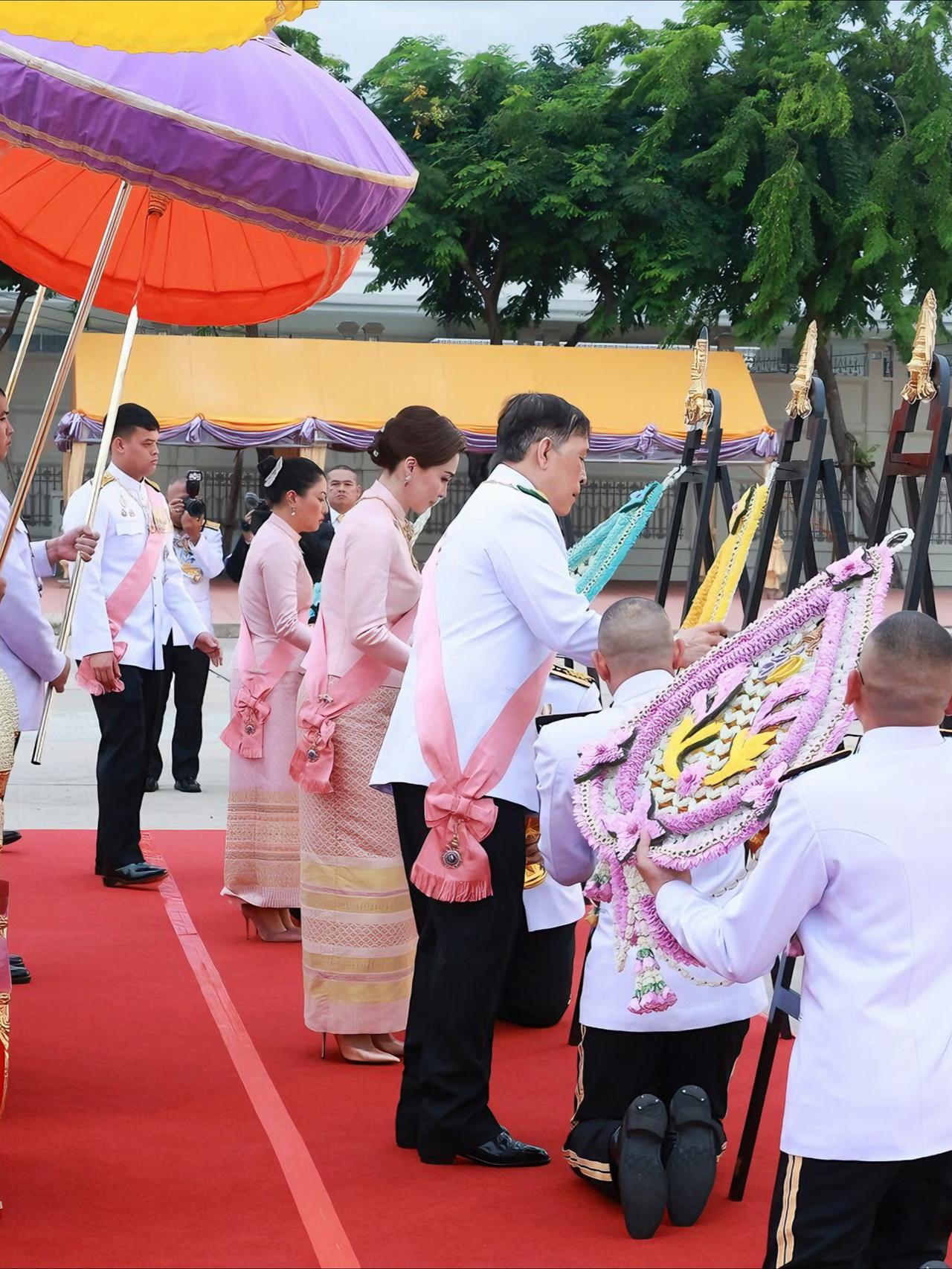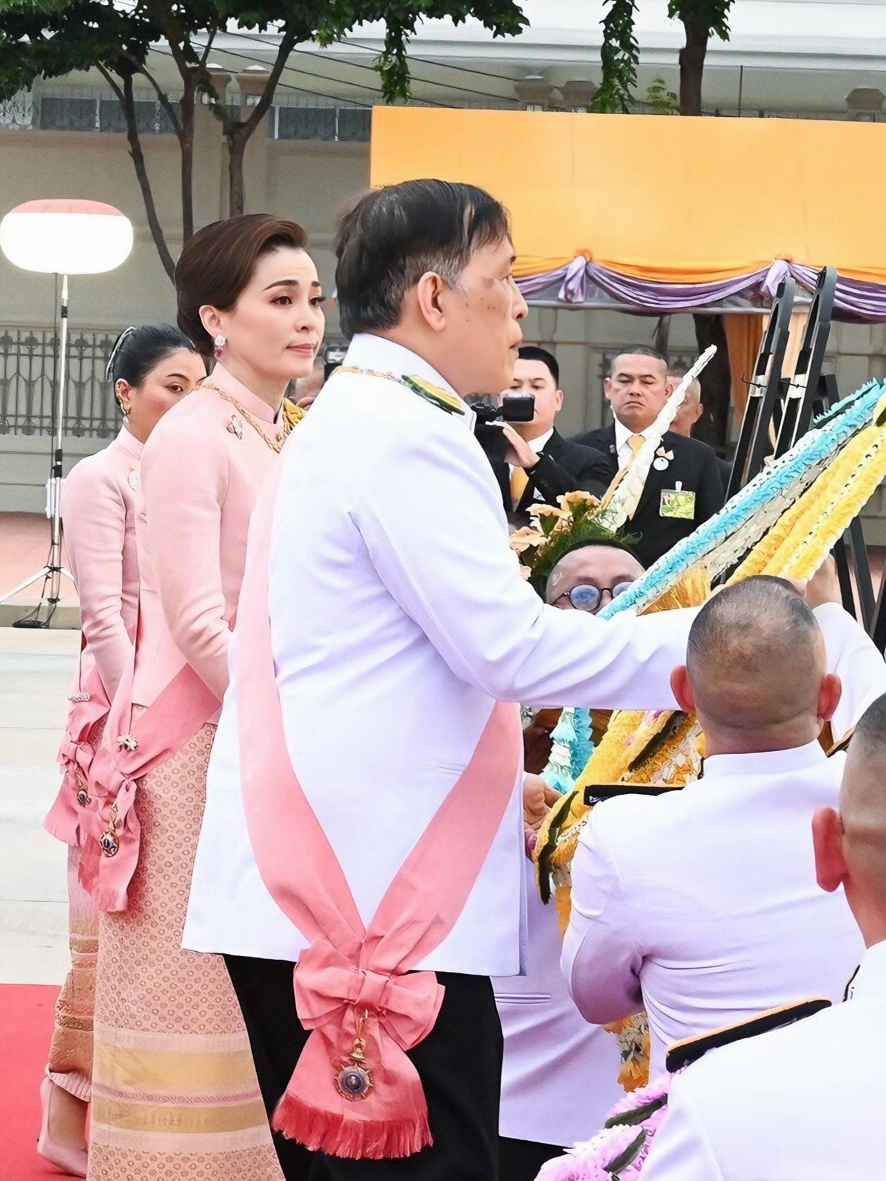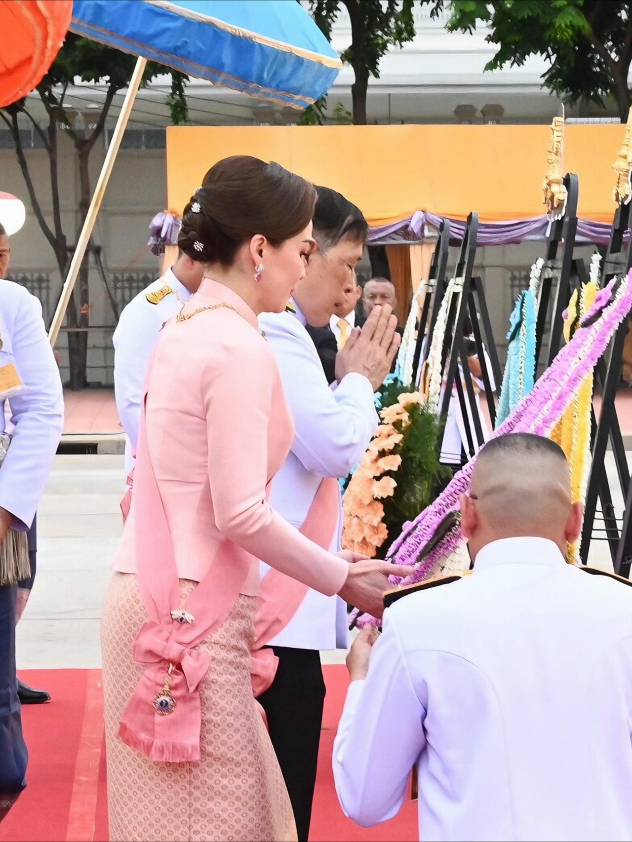 苏提达最新造型好美,樱花礼服仙气飘飘 2025年10月23日下午5点21分,国王和王后,乘皇家专车去杜斯特宫,朱拉隆功国王纪念碑敬献花圈,思蕊梵公主与提帮功王子也一同出席。众人抵达后,敬献个人花圈、点燃香烛,并摆上少量供品以表敬意。之后,他们又登上皇家专车,前往大皇宫阿玛琳·威尼猜王座大厅,参加朱拉隆功节皇家功德仪式。