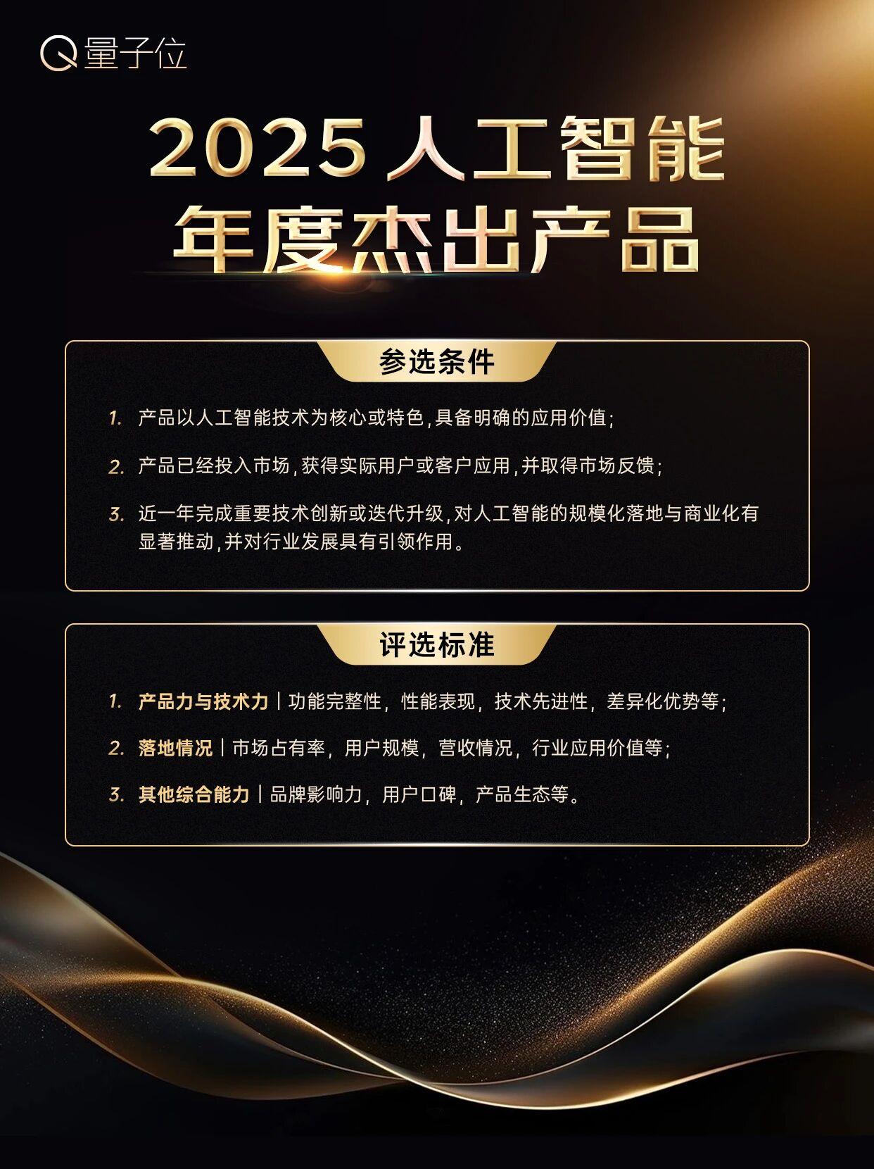 📣 年度AI风向标征集中 —— 现在,「2025人工智能年度榜单」正在面向AI企业开放报名! 这是量子位人工智能年度榜单的第8年。我们期待通过这场年度评选,去发现并致敬那些真正引领变革、开拓边界的探索者与实践者。 本次评选将从企业、产品、人物三大维度,设立五类奖项。欢迎企业踊跃报名! 🏅 企业榜 🔹 2025 人工智能年度领航企业 🔹 2025 人工智能年度潜力创业公司 🏅 产品榜 🔹 2025 人工智能年度杰出产品 🔹 2025 人工智能年度杰出解决方案 🏅 人物榜 🔹 2025 人工智能年度焦点人物 本次评选从即日起开始报名,截至2025年11月17日。评选结果将于量子位主办的MEET2026智能未来大会上正式公布。 ☄️ 网页端报名链接: #MEET智能未来大会# #量子位人工智能年度榜单#