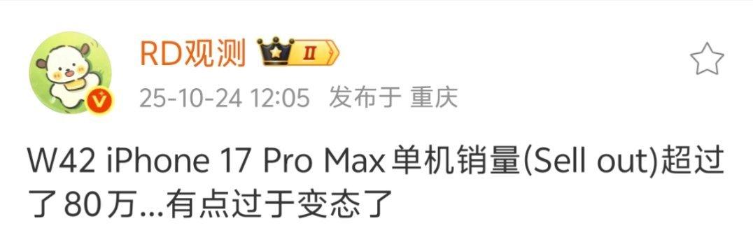 上周苹果国内手机市场份额突破28%,而且iPhone17Promax单周销量破80万,太夸张了[允悲]。