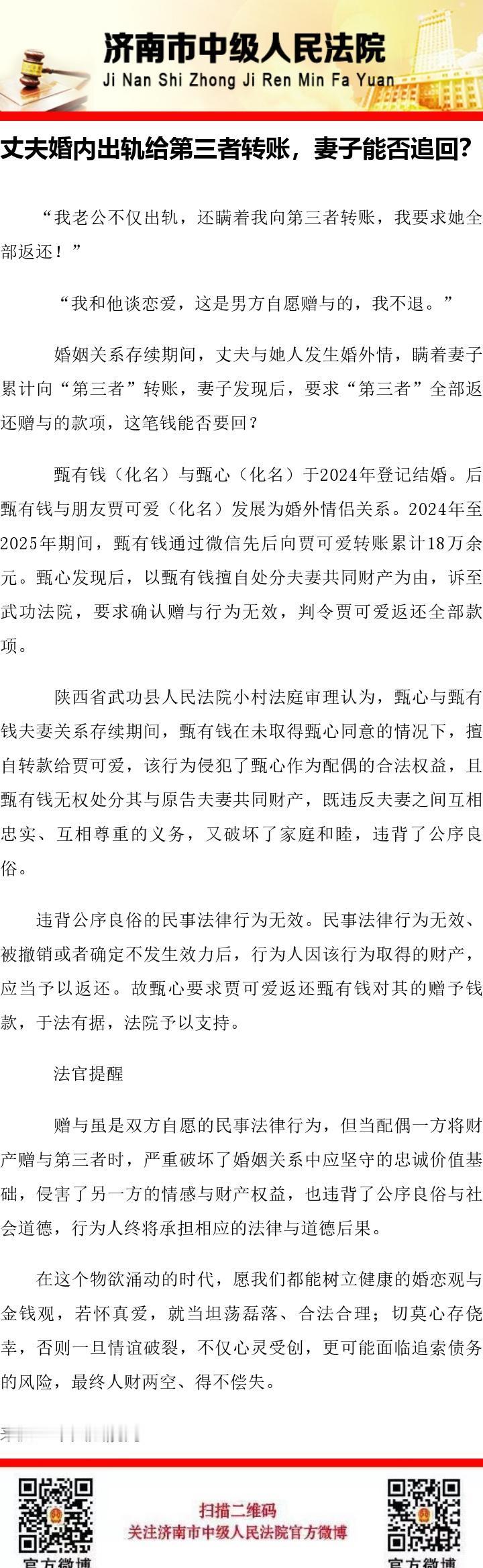 【丈夫婚内出轨给第三者转账,妻子能否追回?】