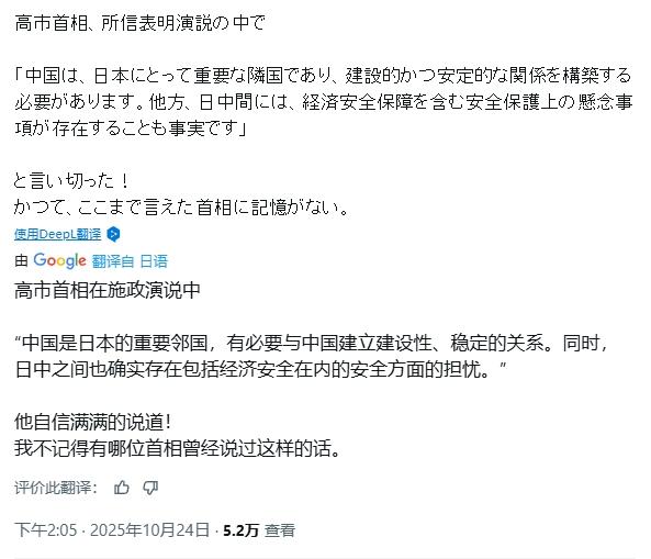 不表演极端了?高市早苗施政演讲:中国是日本重要的邻国 截至目前,高市早苗上任后的言论,主打一个“低调中庸”。 24日高市早苗发表了施政演说,介绍她担任首相后的政治纲领。 其中在外交与安全政策方面,高市早苗闭口不谈之前的“台湾有事就是日本有事”,而是表示中国是日本重要的邻国,日方致力于构建建设性、稳定的中日关系,并继续保持坦诚对话,全面推进中日战略互惠关系。 当然了,也不能说高市早苗一点都没提“中国威胁论”,但即使在这个话题上,她只是蜻蜓点水地提了一句“日方对中俄朝的军事动向感到担忧”、“中日之间确实存在经济与安全关切”——然后就没有然后了。 对于高市早苗的转变,之前我们就说过,她的那些极端言论只是迎合极右翼群体的表演而已,既然现在已经当上首相了,自然也就不用继续再演下去。 我们看了一眼日媒的评论区,反正某些日本极右翼网友对高市早苗如今的对华立场挺破防的,纷纷表示自己白支持高市早苗了。 应该说,这也反映了票选政治的一个弊端:这帮日本极右翼上次就被参政党耍了一次,居然还不长记性,真以为高市早苗当上首相后会践行她的极端口号。